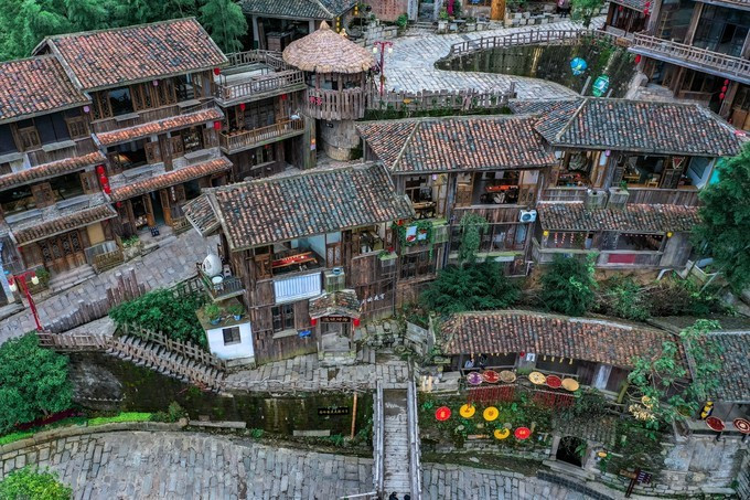 一排排古色古香的木质角楼,从山下爬到山腰,攀到山顶,一层层,一摞摞。张开的窗户,仿佛每一扇后面都藏着一位正在梳妆打扮的姑娘,眉清目秀,温文尔雅。