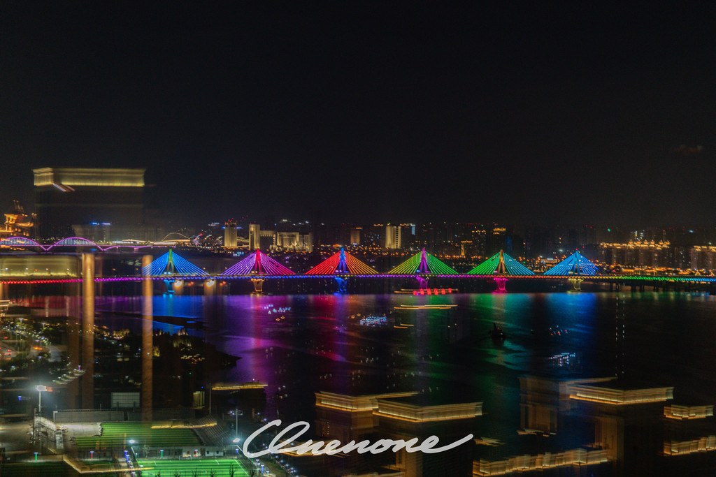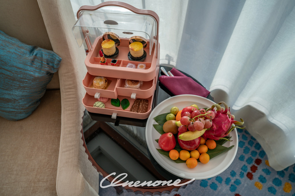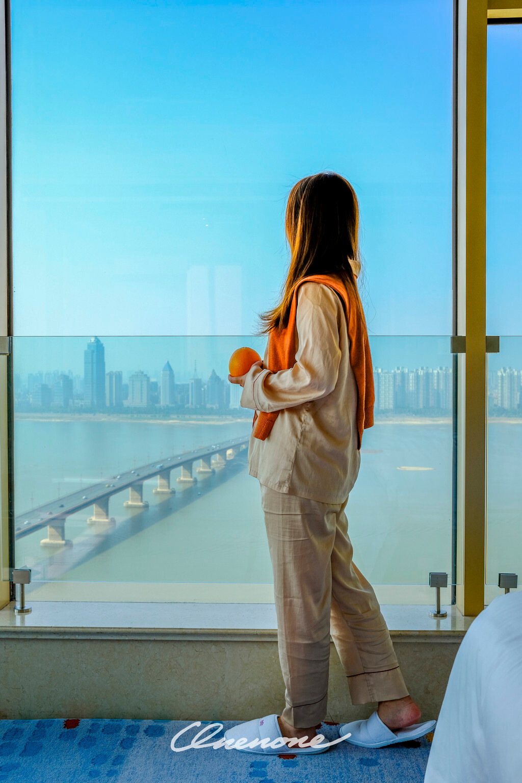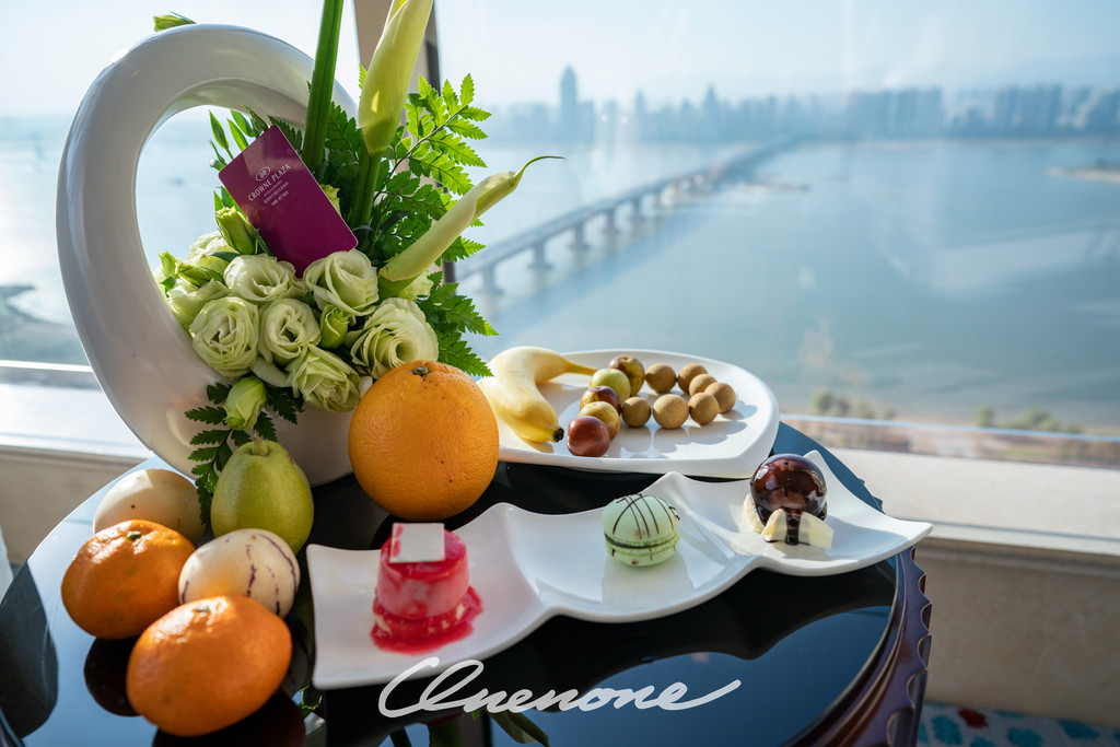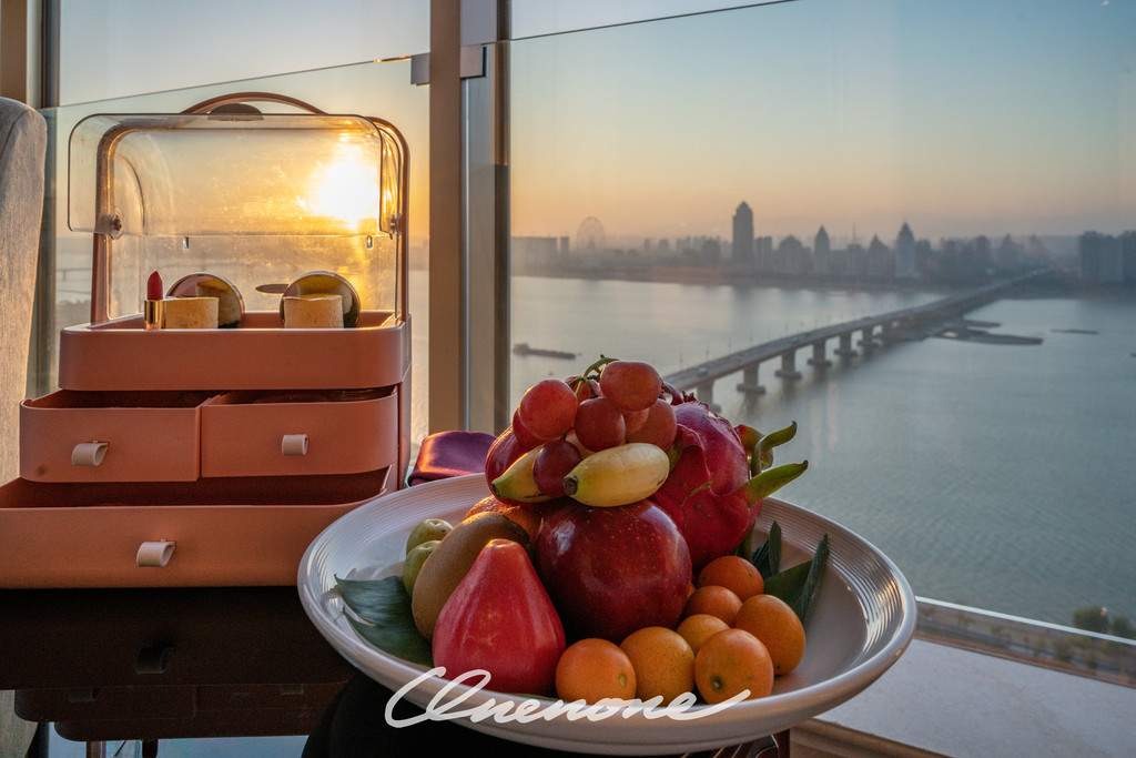 酒店380间客房主要分为园景和江景两种房型,这次我入住的是29层江景套房,可以180度欣赏赣江江景,日落时分景致格外迷人。酒店还贴心的送来欢迎水果和甜品。记得在日落前点一份彩妆下午茶套餐,你将享受到的不只是视觉和味蕾的双重盛宴,更是融于美食中的巧妙心思。透过客房视野开阔的全景落地玻璃窗,夕阳与晚霞在此交汇,明媚气息于空气中蕴散。