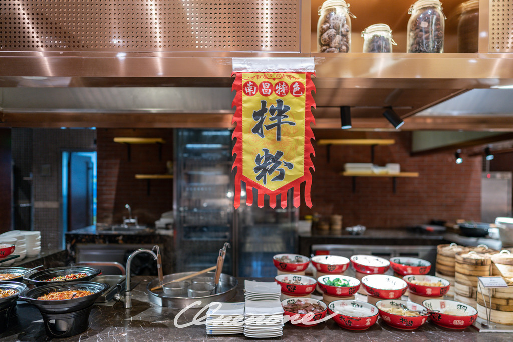 酒店的自助早餐十分接地气,让下榻酒店的客人不用走街串巷寻觅,就能吃到用搪瓷碗盛着的特色拌粉,而且还能根据客人自身喜好,让厨师调整咸辣程度,口味地道且独特。