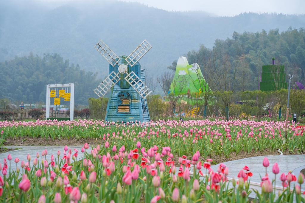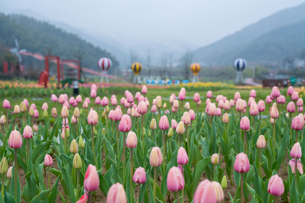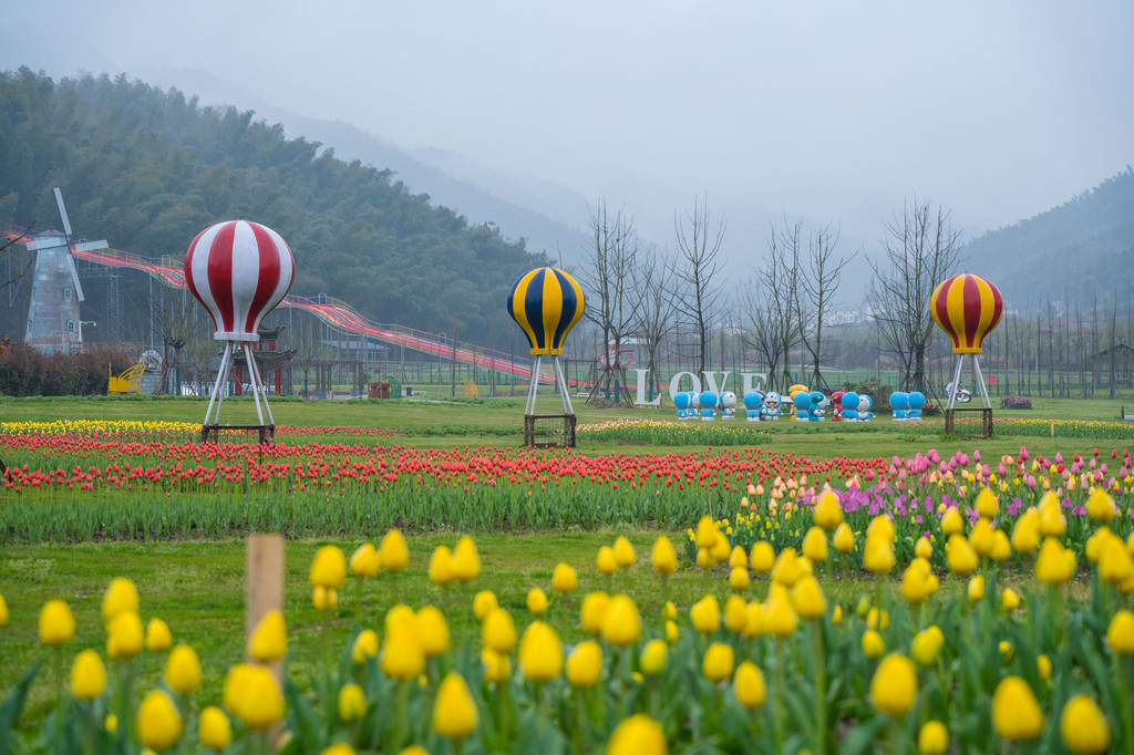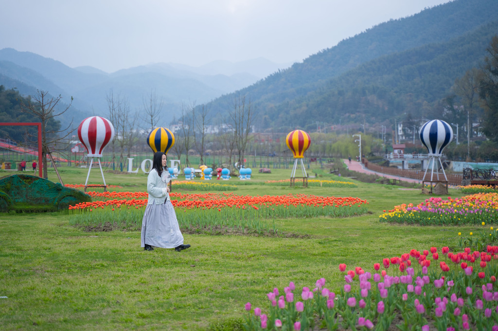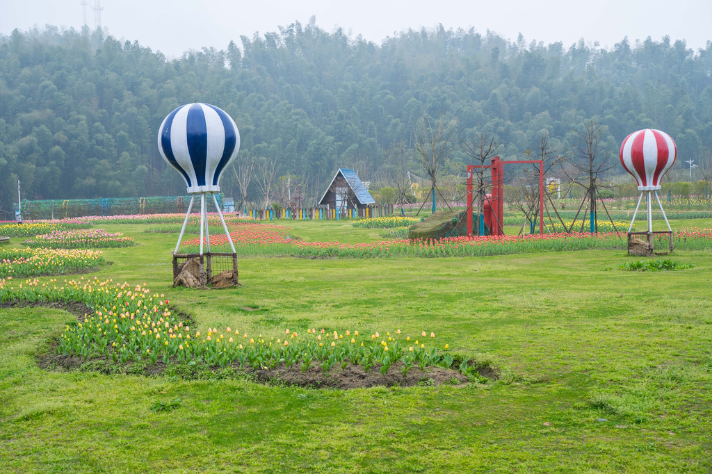 九龙溪田园综合体的郁金香花海,是我见过最美的郁金香花海,之前也曾在其他地方欣赏过,但以郁金香高昂的价格使得大多数都是展示在城市公园之中。而在九龙溪,眼前五彩斑斓的郁金香花海,不远处云雾缭绕的青山,以及花海中分布着的风车、“氢气球”····共同构建了眼前所见的这幅美景,深处自然之中的花海才是最美的。
