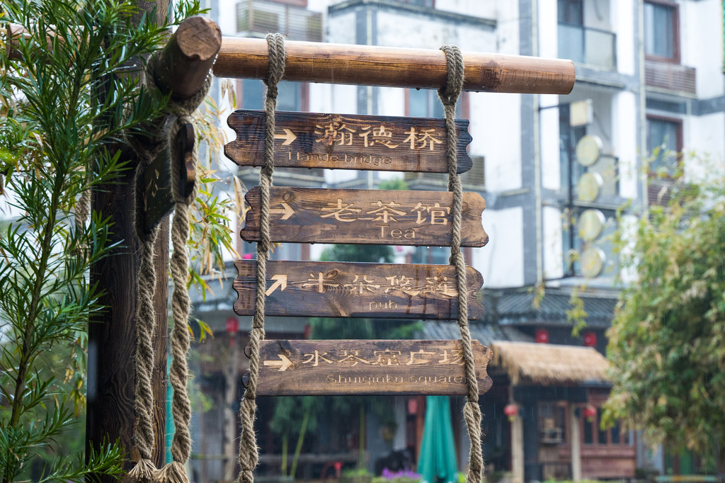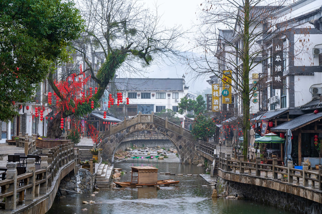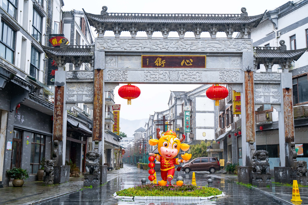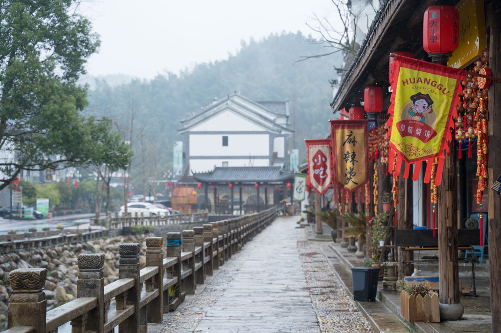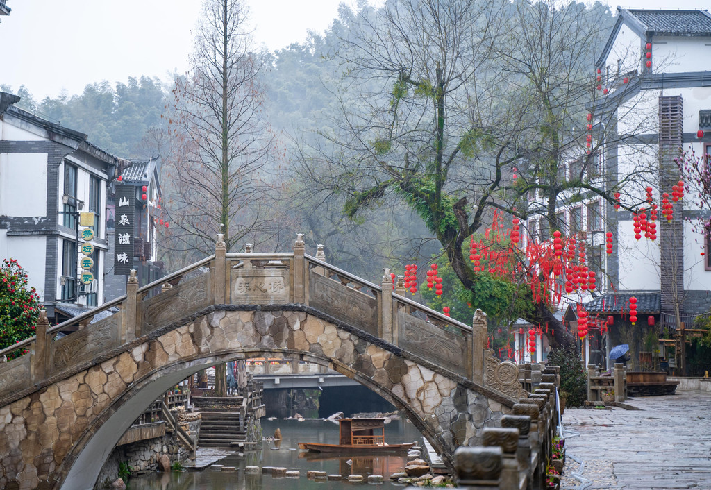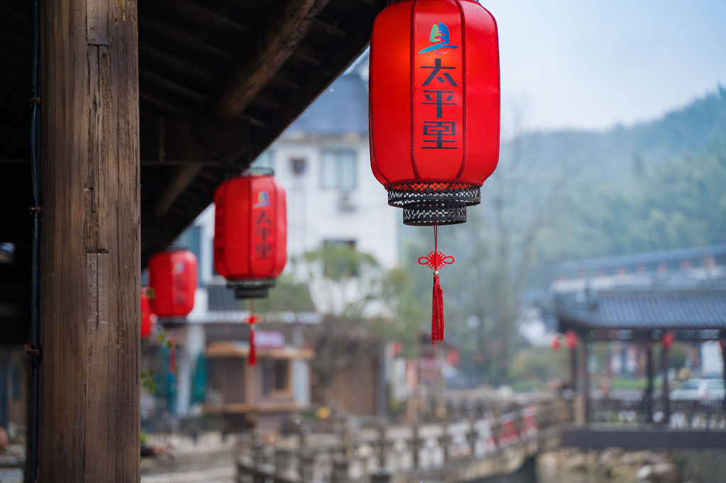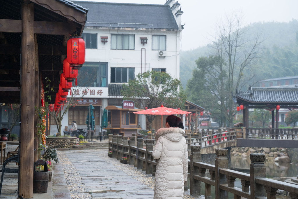 太平心街,并不需要门票,淅沥沥的春雨,心街上并没有多少行人。在心街的入口处,有诸多可以合影留念的地方,比如刻有“心街”的牌坊、亦或是广场上的龙型石像。心街并不大,两条并列而行的街道一直向山里的方向通去,一条街道靠山,一条街道临河。而瀚德桥则是这里的地标性建筑,横跨在河流上方,站在桥上的人在看远处的山水,而桥下的人在看他,书本里的画面都有了。