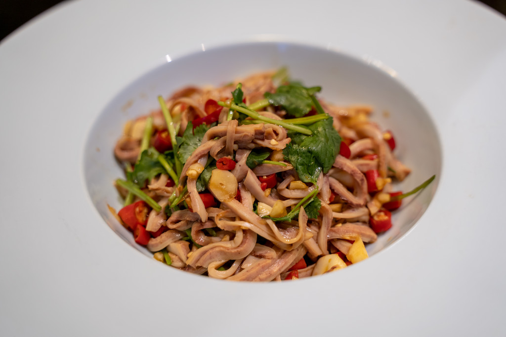 林恩红茶红烧肉,红烧肉这样一道家常菜品在这里却又变得不一样,当地的土猪肉,在烹煮的过程中加入林恩红茶,色泽红润诱人,红烧肉入口即化,茶叶的存在很好的化解了肥肉的油腻,因此吃起来肥而不腻,肉香浓郁。