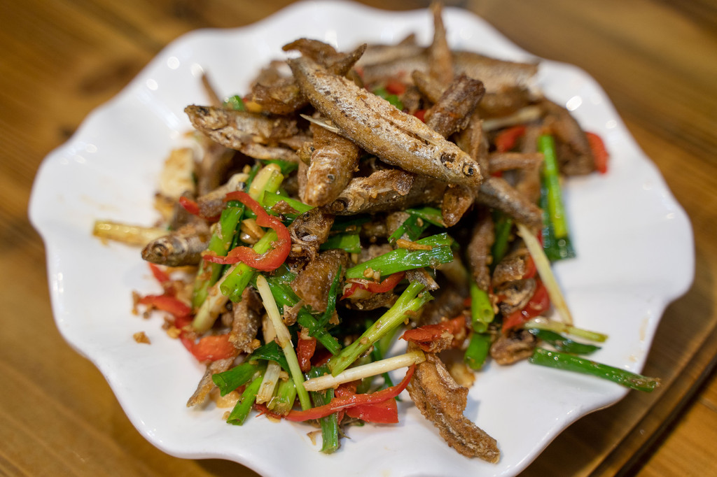 鲜炸小河鱼,这也是一道很具地方特色的菜品。山泉滋味餐厅,顾名思义,这里做菜用的水都是来自梅岭风景区的山泉水,而食材也都是当地绿色自然的食材。就拿这道菜来说,小河鱼都是小溪里面的小鱼,个头不大,但是肉质极为鲜美,油炸之后外酥里嫩,是一道非常下饭的菜。