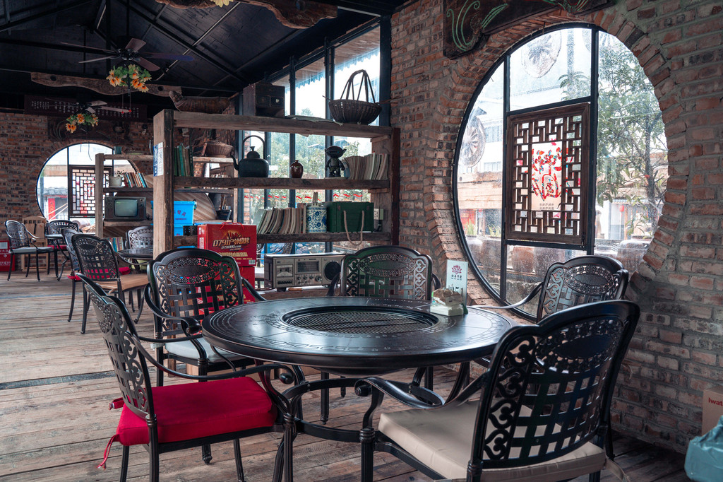 之所以最为喜欢第三个区域,还是因为这片座位区域太让人惊艳。头顶上,是玻璃制成的遮挡,在这样春雨淅沥的日子里,能看到雨水溅到玻璃上的模样,独属于春天的情趣便油然而生;坐下来,从桌子到椅子都是历经岁月打磨的一些“老古董”,本该在博物馆里的它们在这里又焕发了新生。