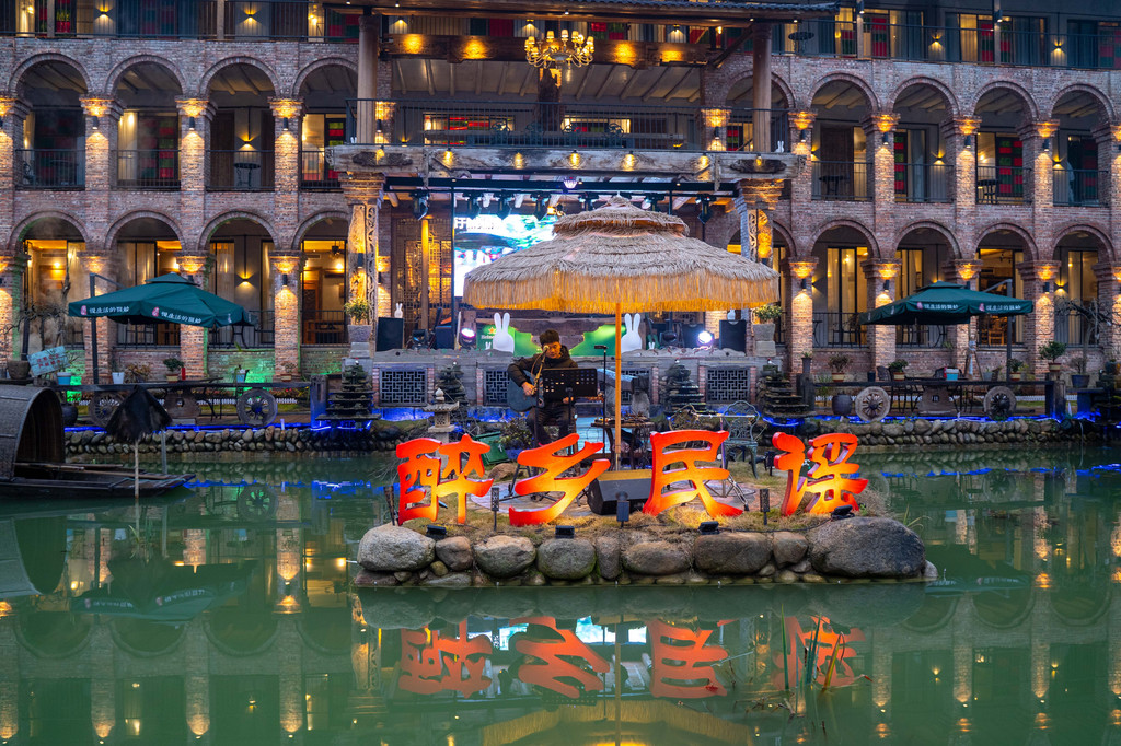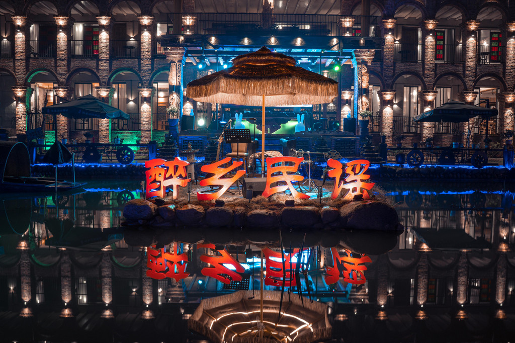 享用完晚餐,迎着山里微凉的风,又回到了醉乡民谣户外清吧。入了夜的清吧,又变了一个模样,也变得热闹了起来,周围的氛围灯都在这夜空中点亮,歌手坐在水池中的舞台弹唱,和三五好友找一处中意的座位坐下,喝酒聊天,享受这山里的精彩夜生活、