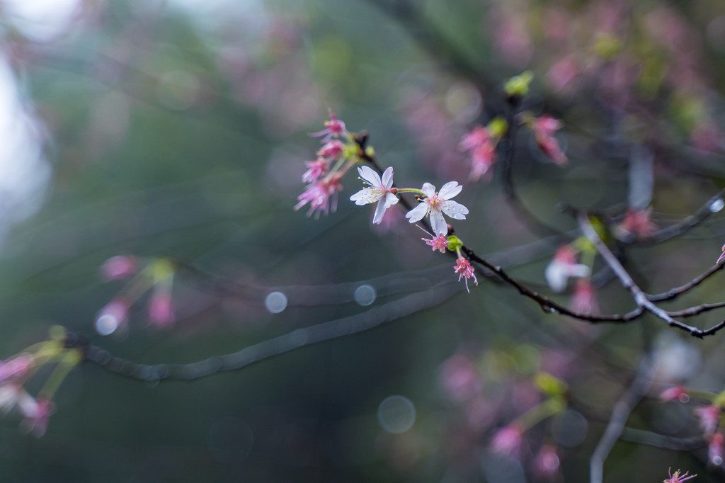 早春微寒,野樱却开的热闹。樱花种类繁多,树形多样,叶茂花繁,丰盈娇艳。在江南,最让人倾情的当属这山林之间的野樱花,红花满枝,纷披婉垂,一朵朵煞是好看的樱花点缀在枝头,恰似红灯点点,乘风荡漾,别具风姿。