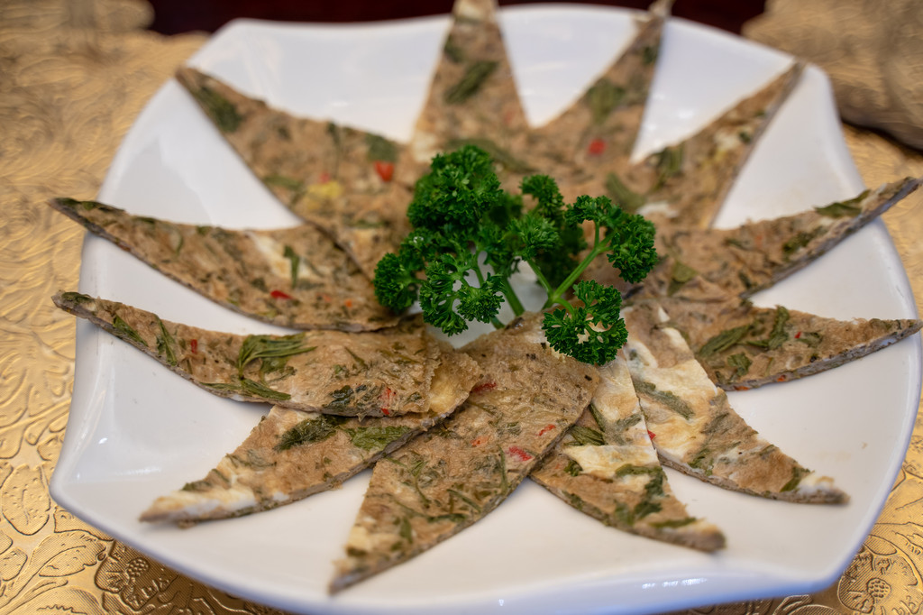 茶叶煎蛋,作为大客天下度假酒店的招牌菜品,这是一道创新菜。酒店四周都是高山茶田,而茶叶则是这里最丰富的食材了。厨师便利用茶叶作为食材打造了全茶宴,让茶叶和其他常见的食材交融碰撞,茶叶煎蛋便是其中非常有特色的一道菜,煎蛋外焦里嫩,入口鸡蛋的香味和茶叶的清香融合在一起,回味无穷。