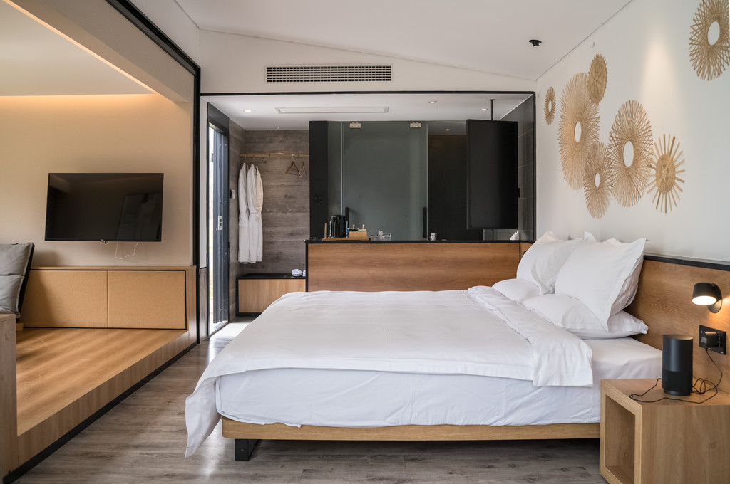 悠莲精品民宿,是在整个半朵悠莲建筑群最靠近山的一侧,这里也是最为静谧的一处。为了能提高住客的度假体验,整个民宿区客房数量并不多,但是房型的种类还是非常丰富的,从溪畔豪华标间到山舍豪华标间,再到山舍豪华套房、山舍亲子套房。在这样自然环境里,整个房间的装修风格也是贴近自然,原木风的设计风格,房间里用了大量的木制家具,让人非常感觉非常温馨。