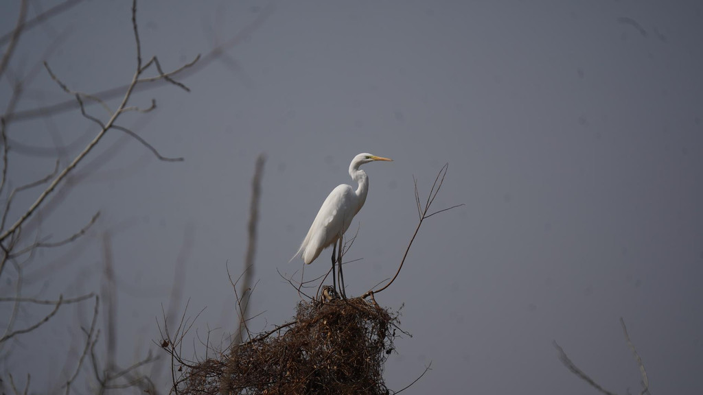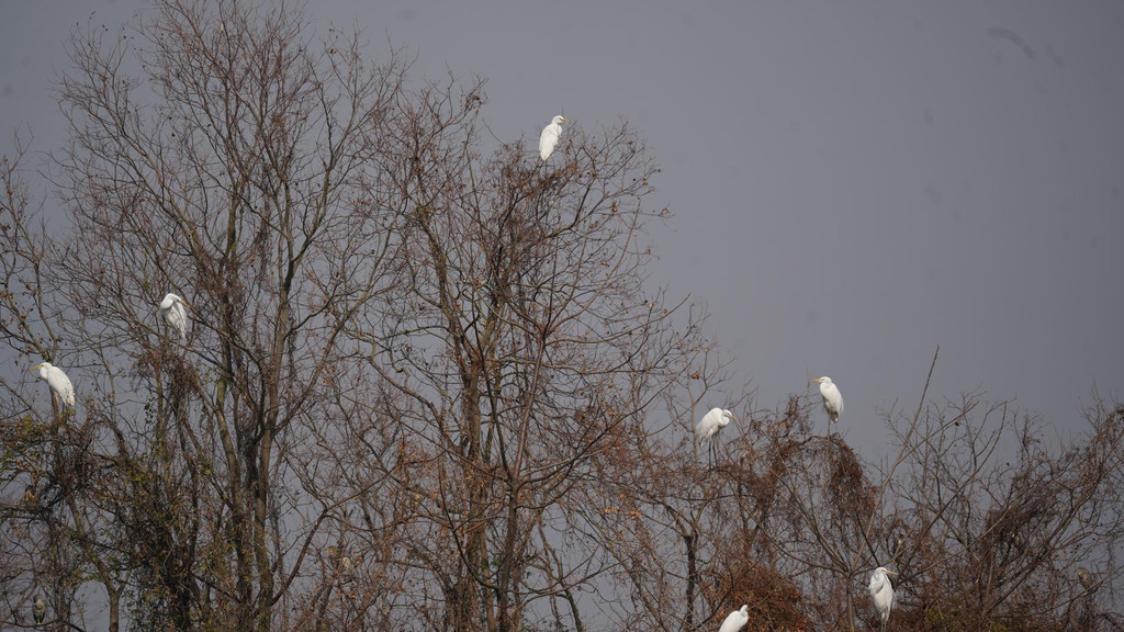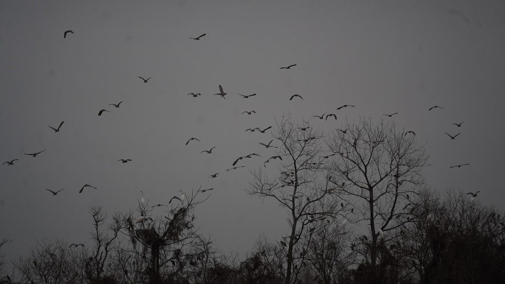 因为要在白鹤洲呆一天,所以两个人不满足于人群在的地方,开始探索起白鹤洲内部的情况,沿着景区的路一直往里走,居然发现了一个鱼塘,鱼塘旁边的树上站满了白鹭和夜鹭。再往里走,是一片稻田,稻田里有一群天鹅,跑进田里,居然发现了很多鸟尸,有天鹅、绿翅鸭、绿头鸭、鸿雁,不知道什么原因,这片稻田里死了很多。