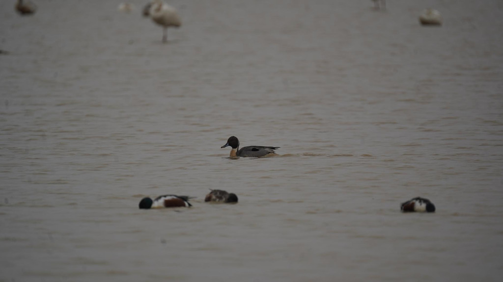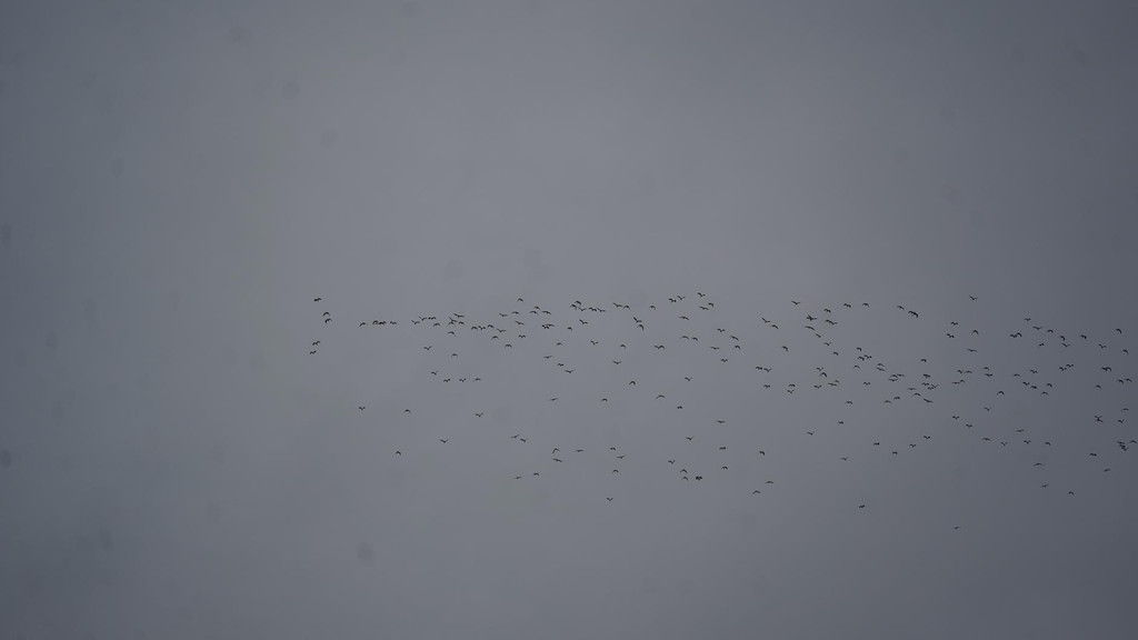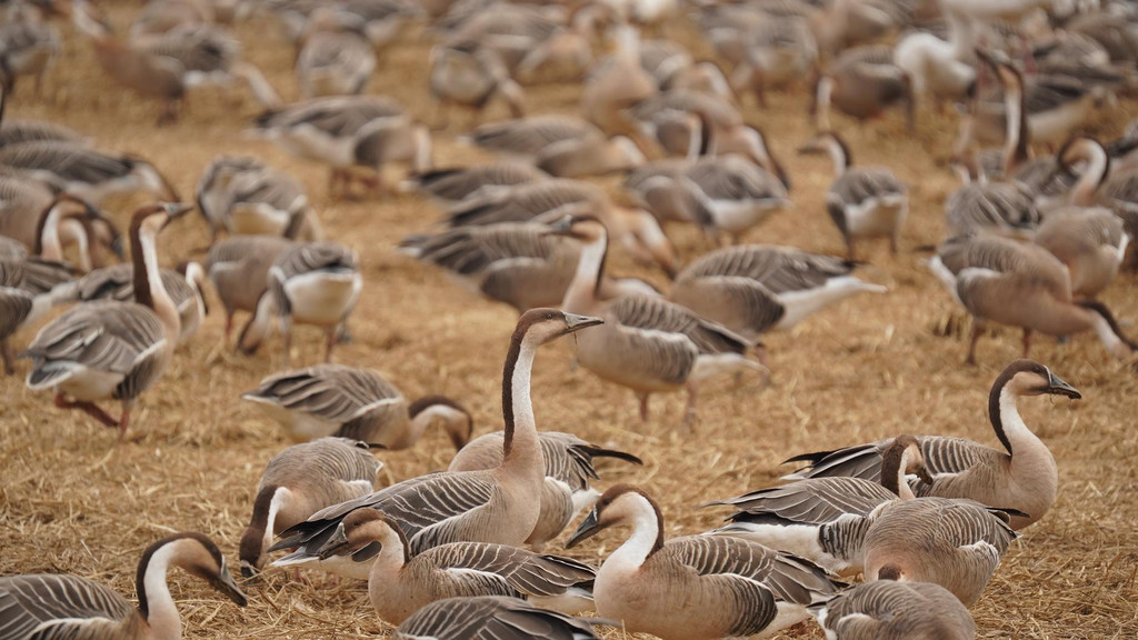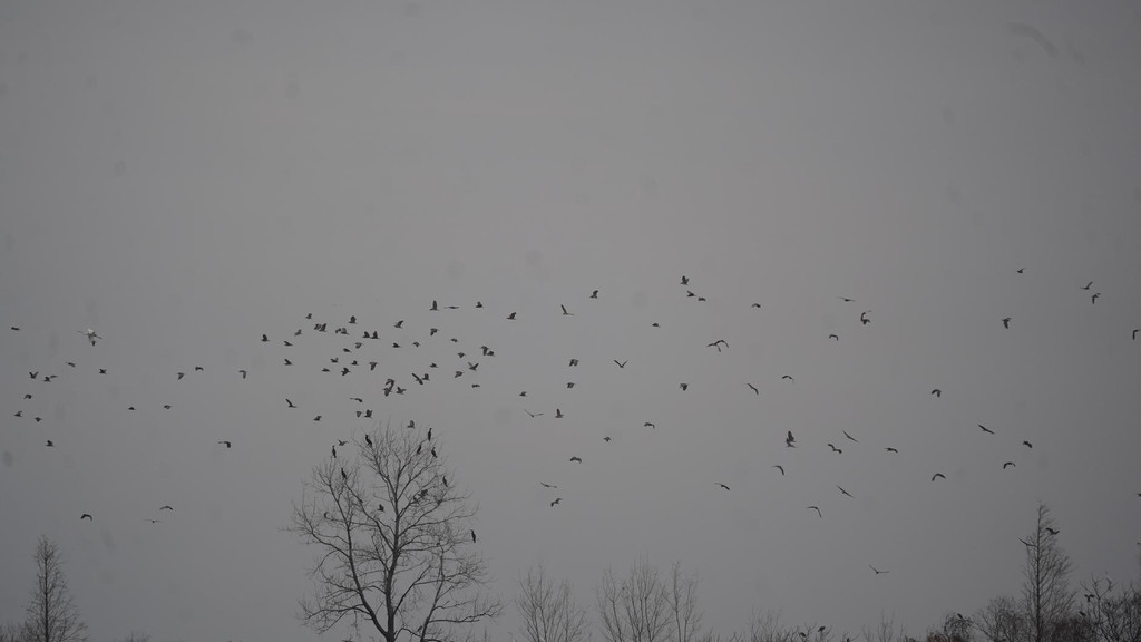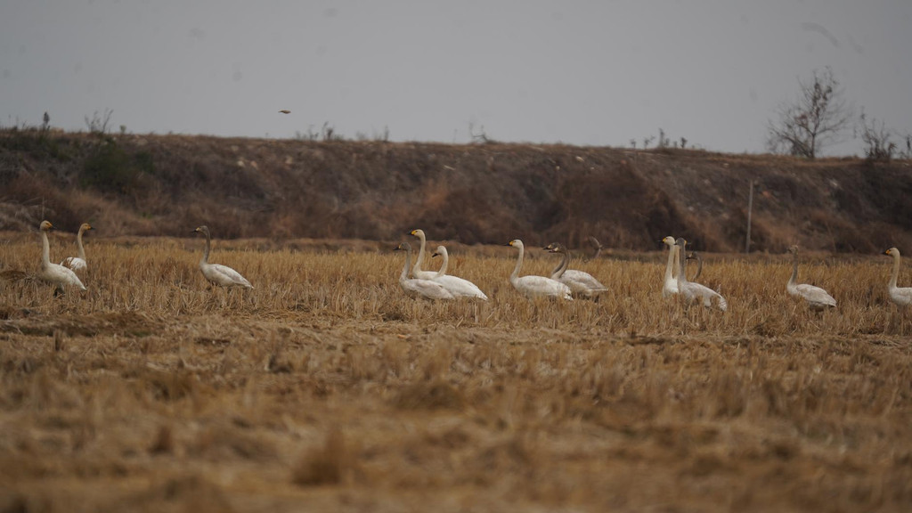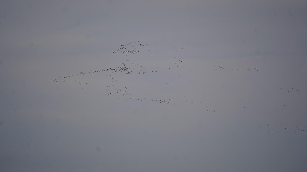 第二天一早,余干县城大概8点出发,8点40到达白鹤洲,路上一路的稻田,白鹤就应当在这样的地方。天气是阴天,能见度还行。停好车,就发现收割完的稻田里站着一群群鸟,有白鹤、有灰鹤,有鸿雁,声音上,叽叽喳喳、吵吵闹闹,行为上,要么吃,要么发呆,真是成功的鸟生啊!