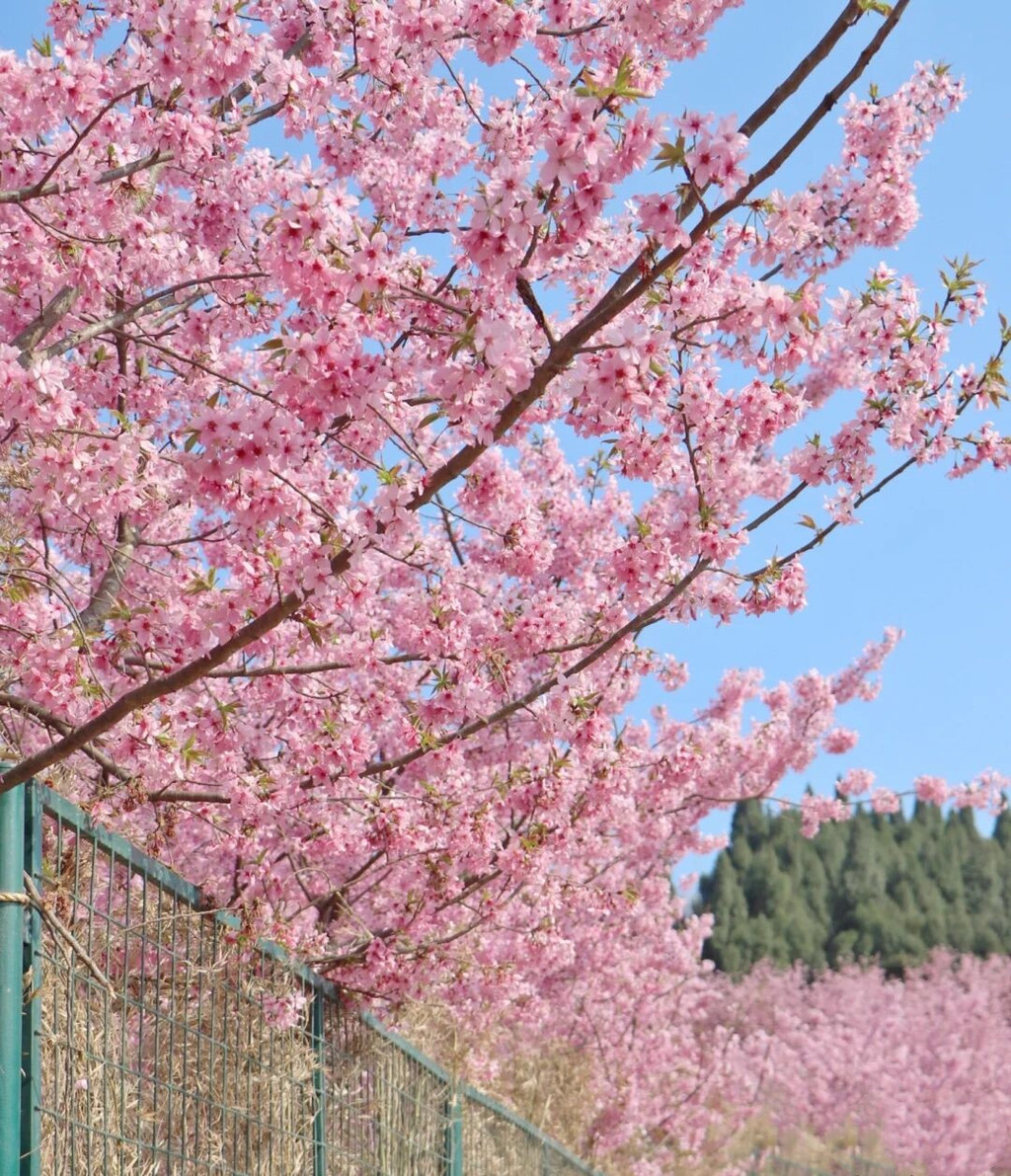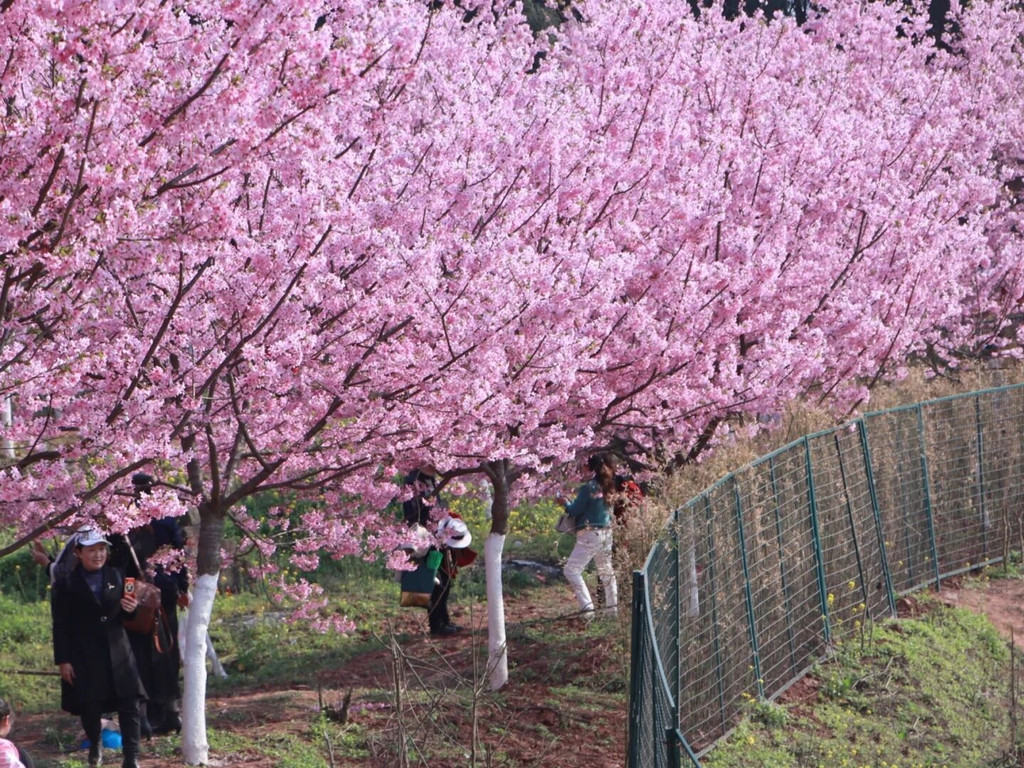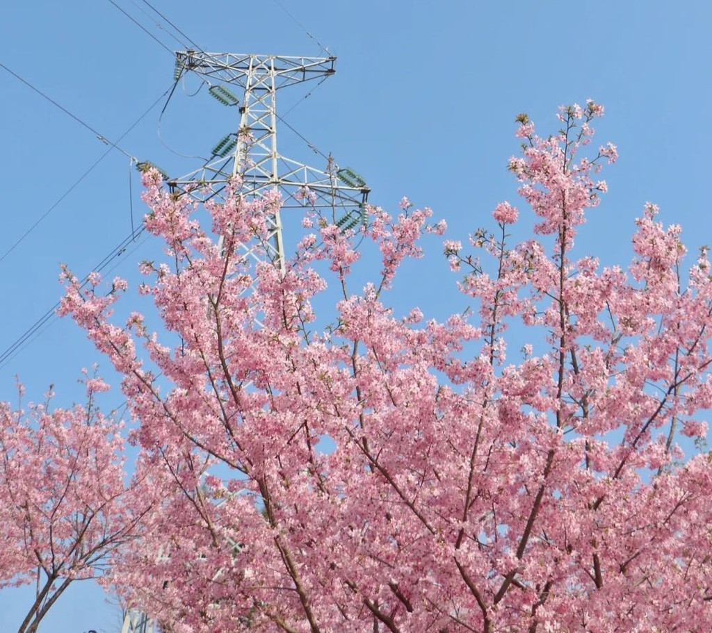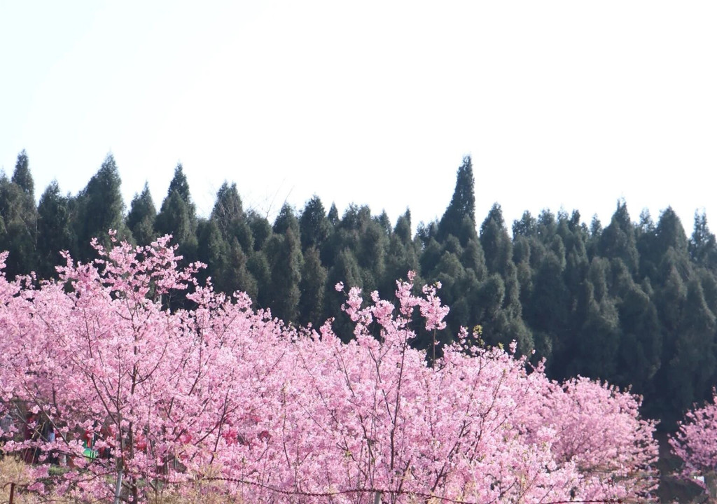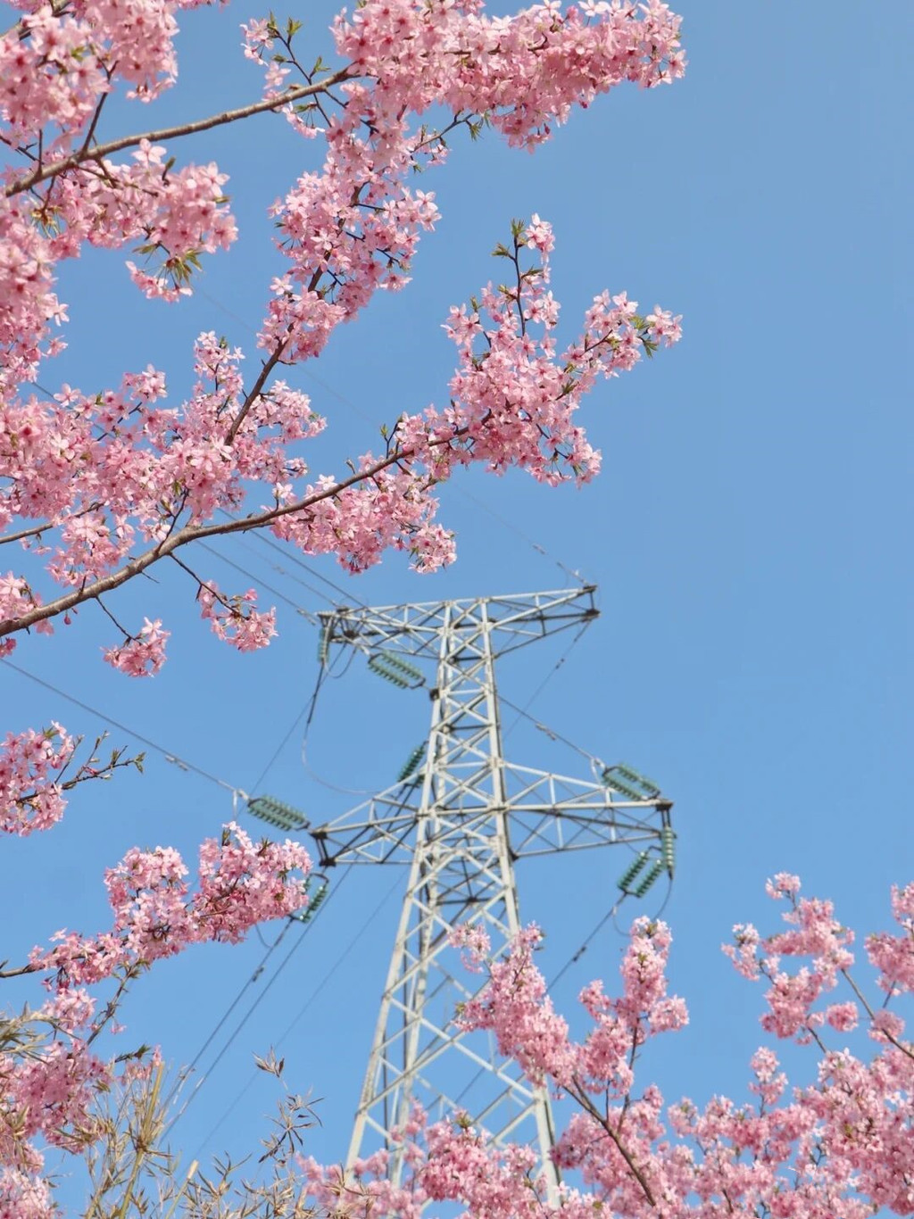 走进澜岭江花就能看到那一大片的粉,中国红樱的樱花树笔挺高直,枝条上的樱花如同团团火焰,勃发着生命的魅力。