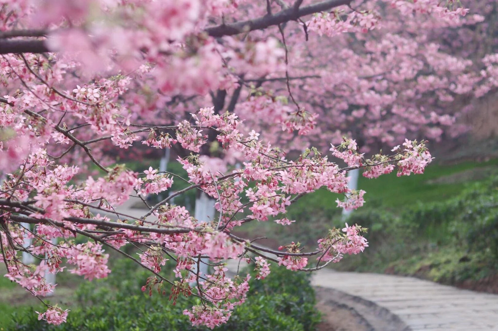 这里的樱花占地面积约400余亩,安吉拉、蓝色阴雨以及中国红樱、日本红白樱等60多种樱花相继绽放;