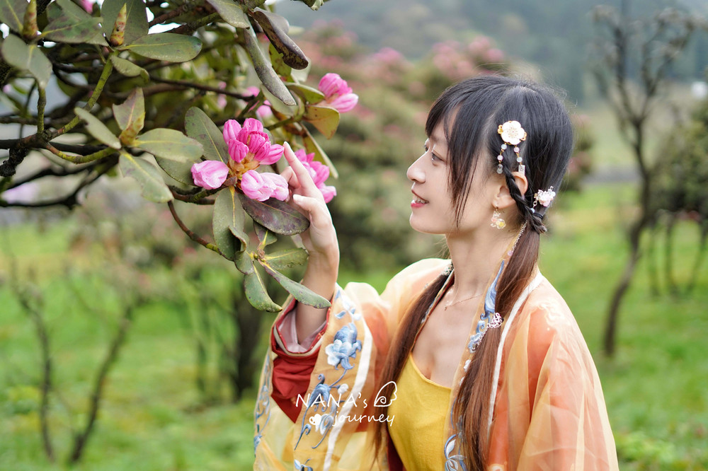 不过杜鹃花是不能摘的,可以从地上捡那些被春雨和大风吹下来的残花当配饰(捡到几率还挺大的,毕竟金佛山的风很厉害!),会更有氛围~推荐动作:闻花香。