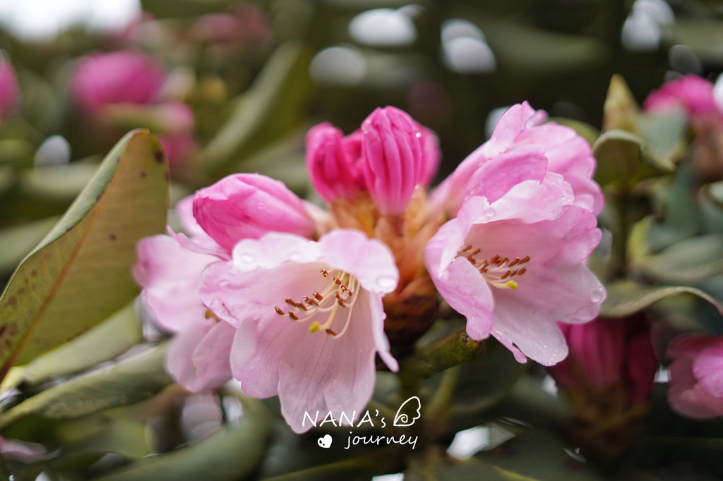 山顶的杜鹃花品种也可以看到不少,有阔柄杜鹃、树枫杜鹃、金山杜鹃、喇叭杜鹃、弯尖杜鹃、麻叶杜鹃等,你可以认清多少,反正我只认粉粉嫩嫩的~