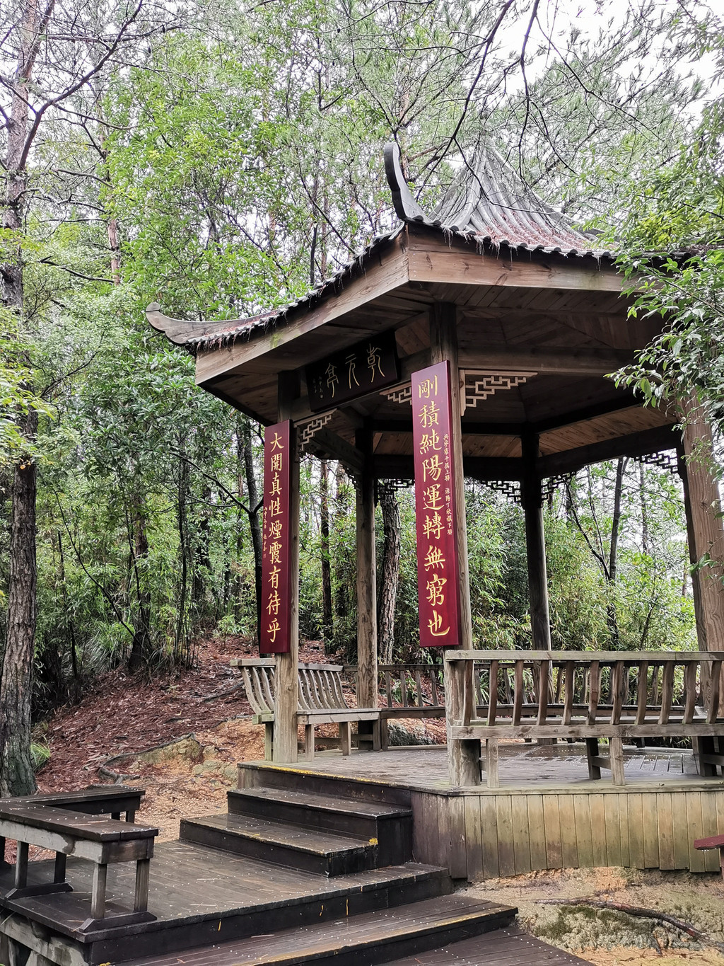 进入景区,趁缆车上到峰顶,再步行去往舵石方向,路两侧古木森森,起起伏伏走了约一公里多。
