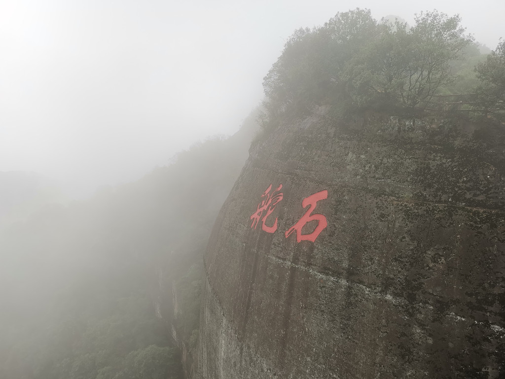 崖壁上刻有“舵石”二字,此点在丹霞山顶部东北端,顶部是观景点,看介绍远处有人面石、睡美人、群象出山、茶壶峰等景点,可惜雾大看不见。
