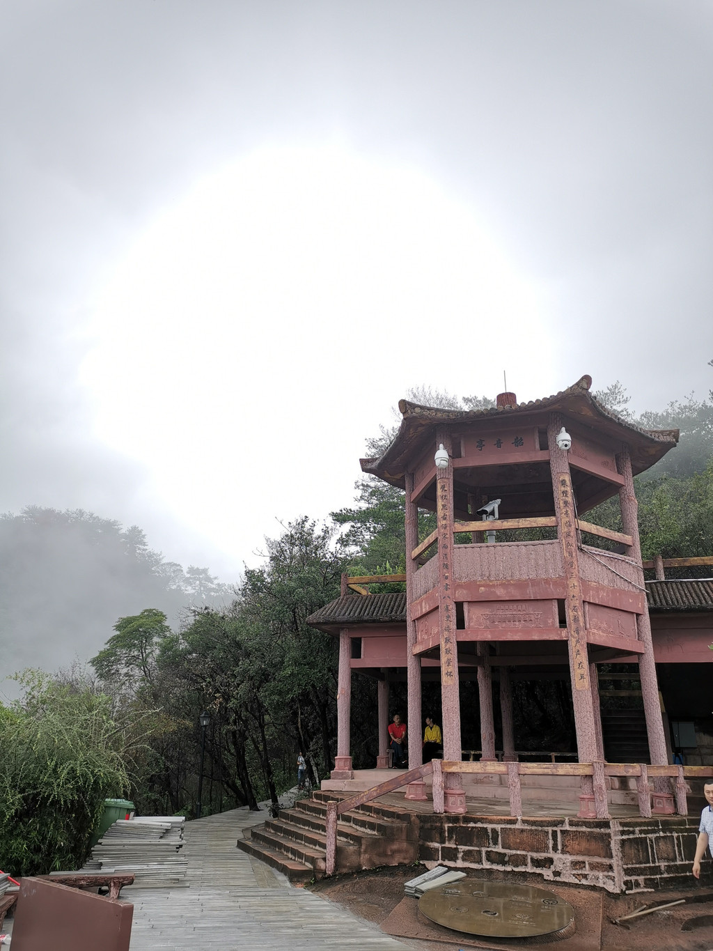出得寺院,站在寺门口向远方看,青山滴翠,云雾缭绕。