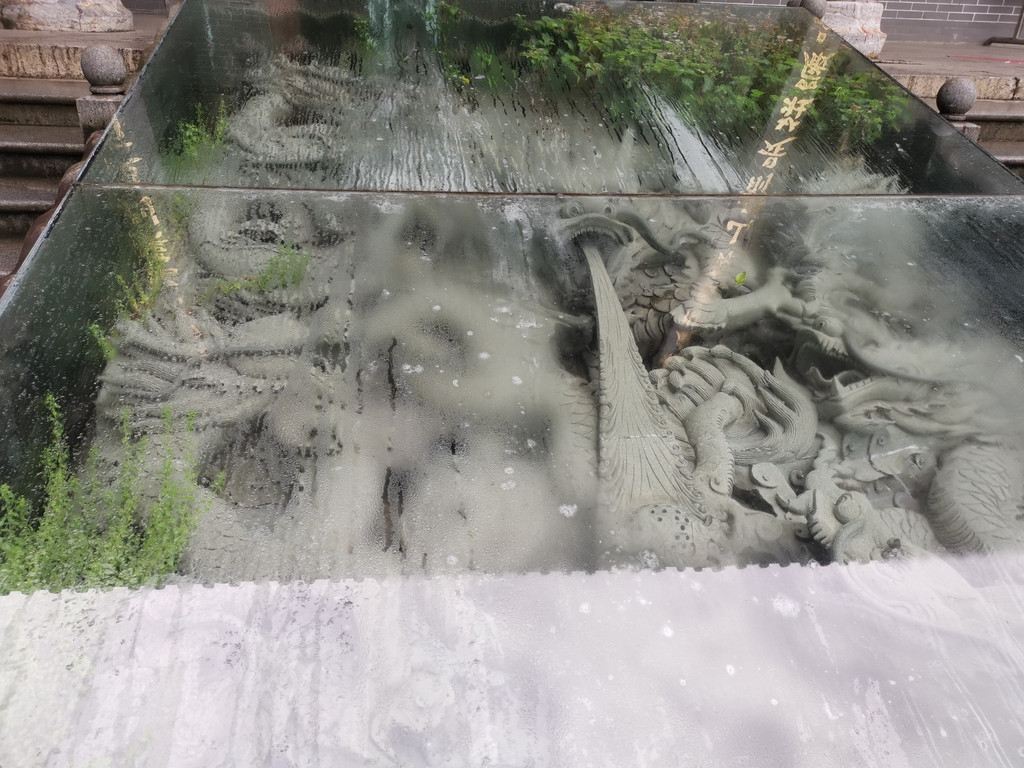 殿前用玻璃盖起来的国宝,立体镂空龙吐水石刻。