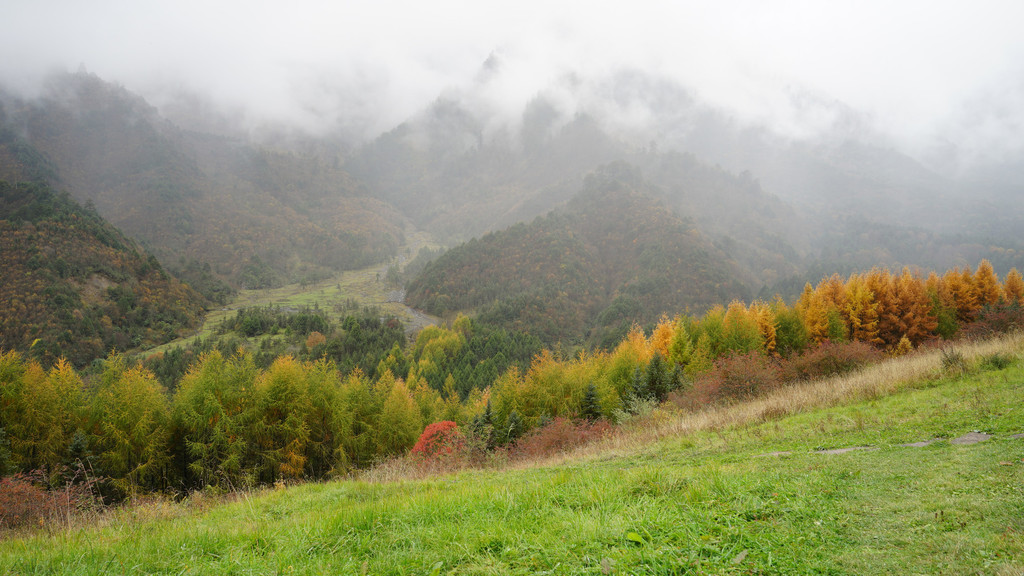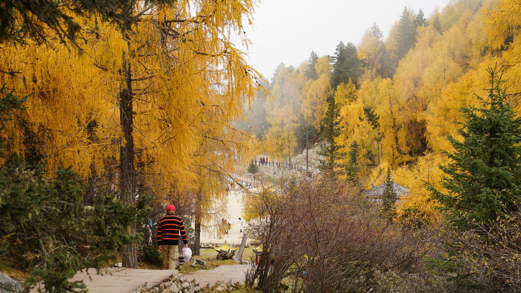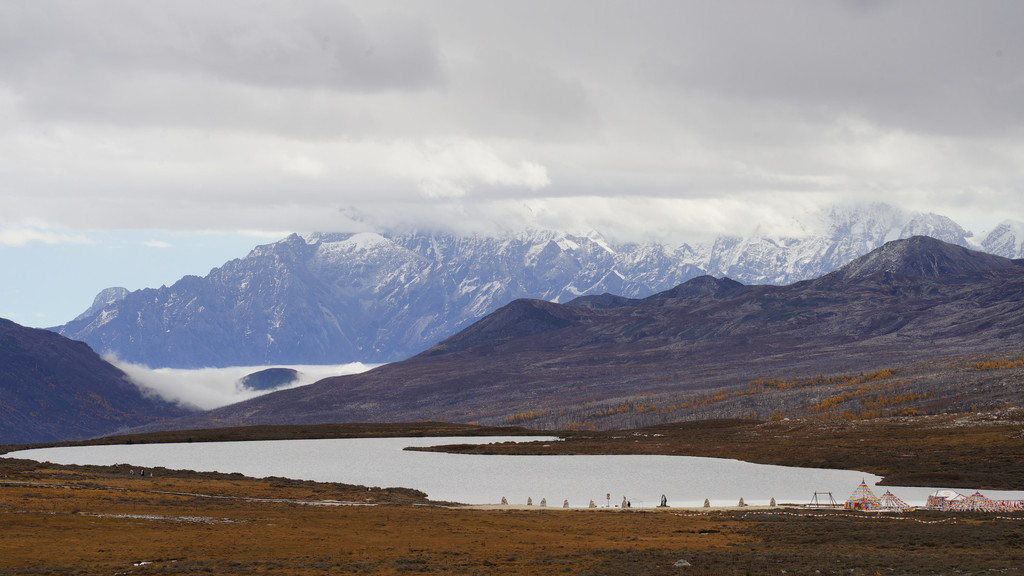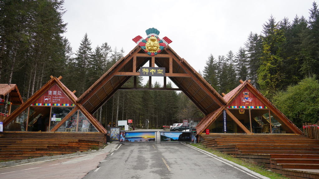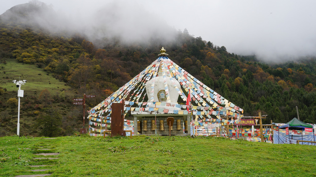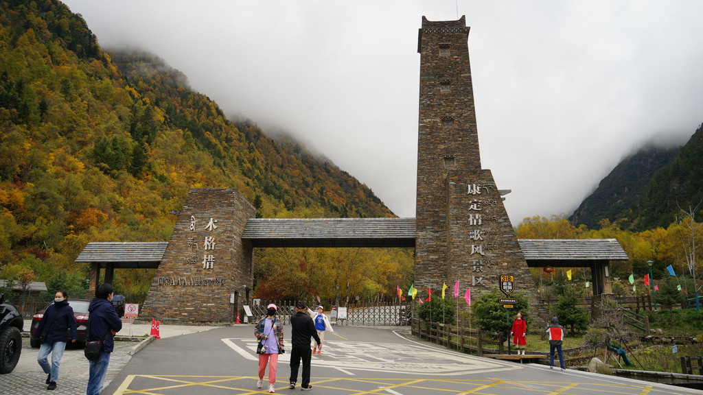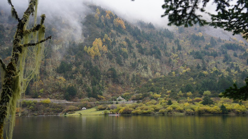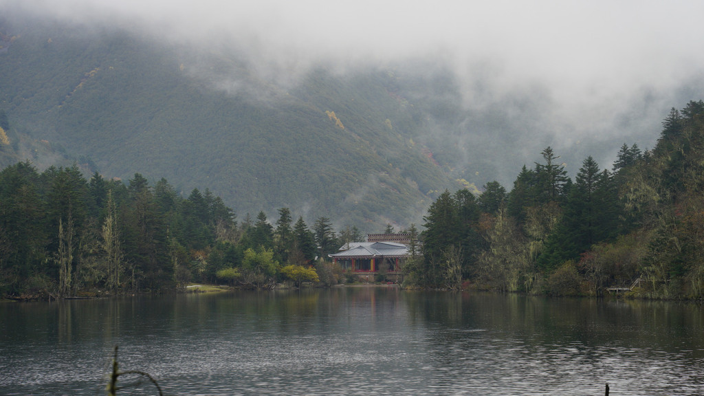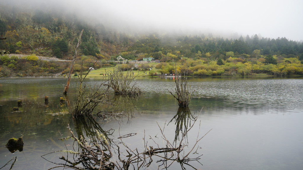 被称为康定情歌风景区的《木格措》其实是条沟,往返90元车票的景交车从沟底盘旋而上,其最著名的是位于高处的的一泓湖,日《木格措》,可是山上大雾迷漫,周围的雪山不见了。
