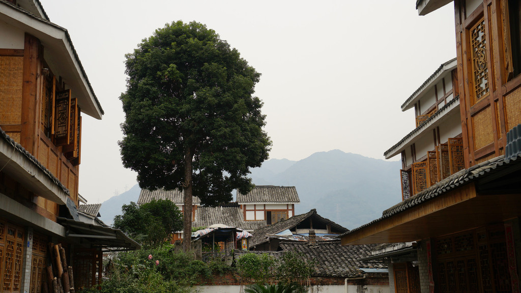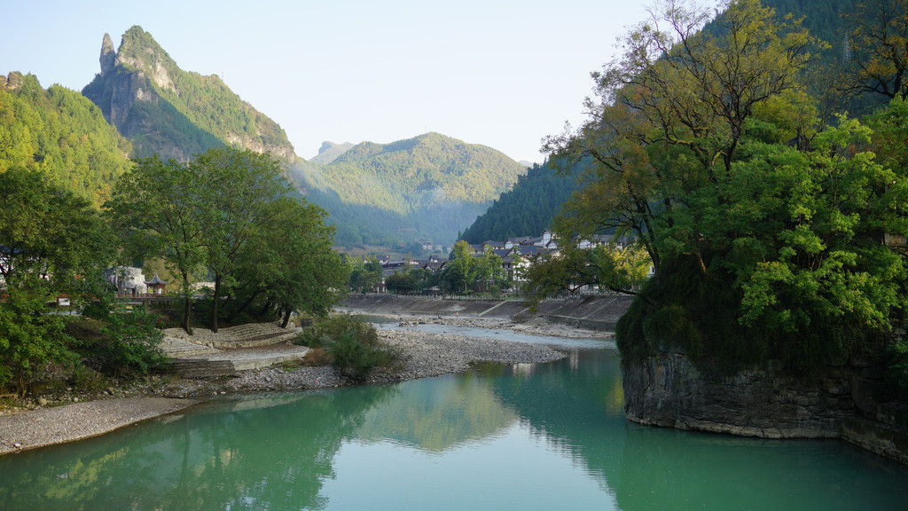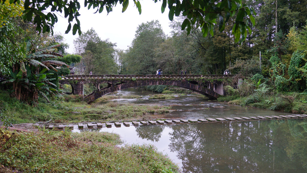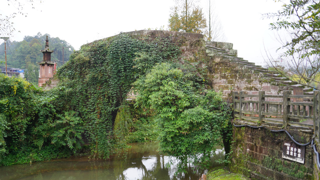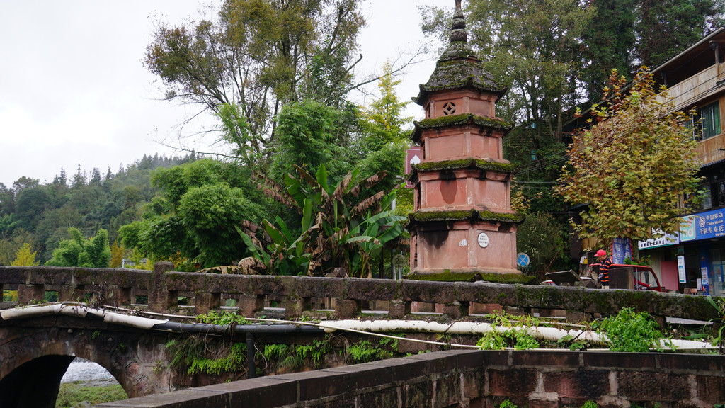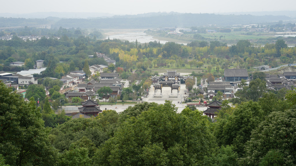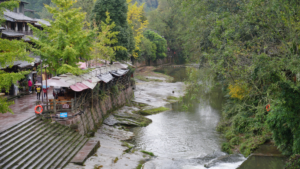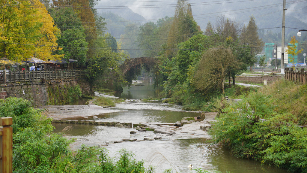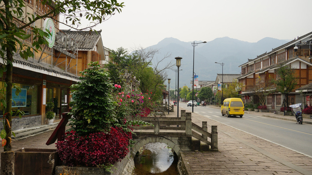 古镇溪水环绕。青山逶迤,蜀文化浓郁