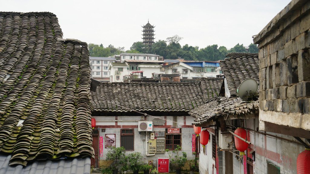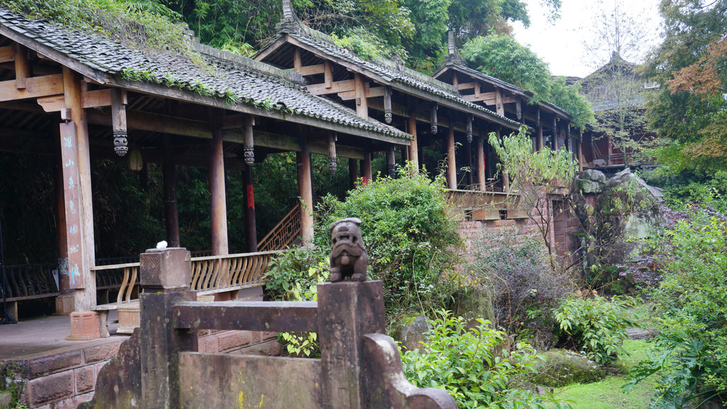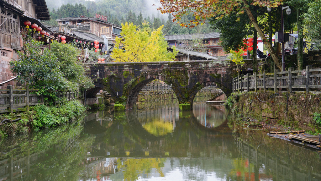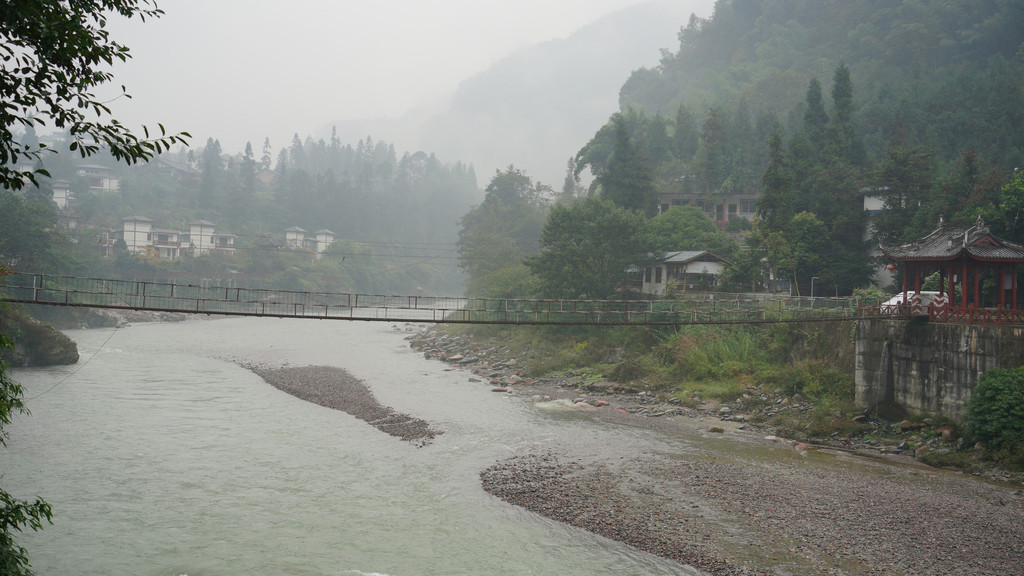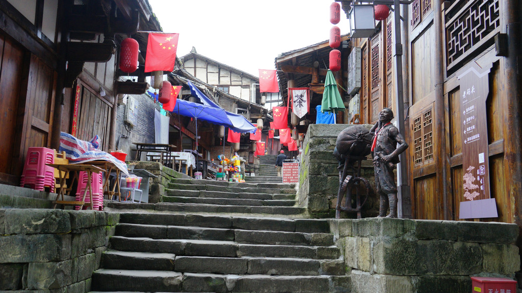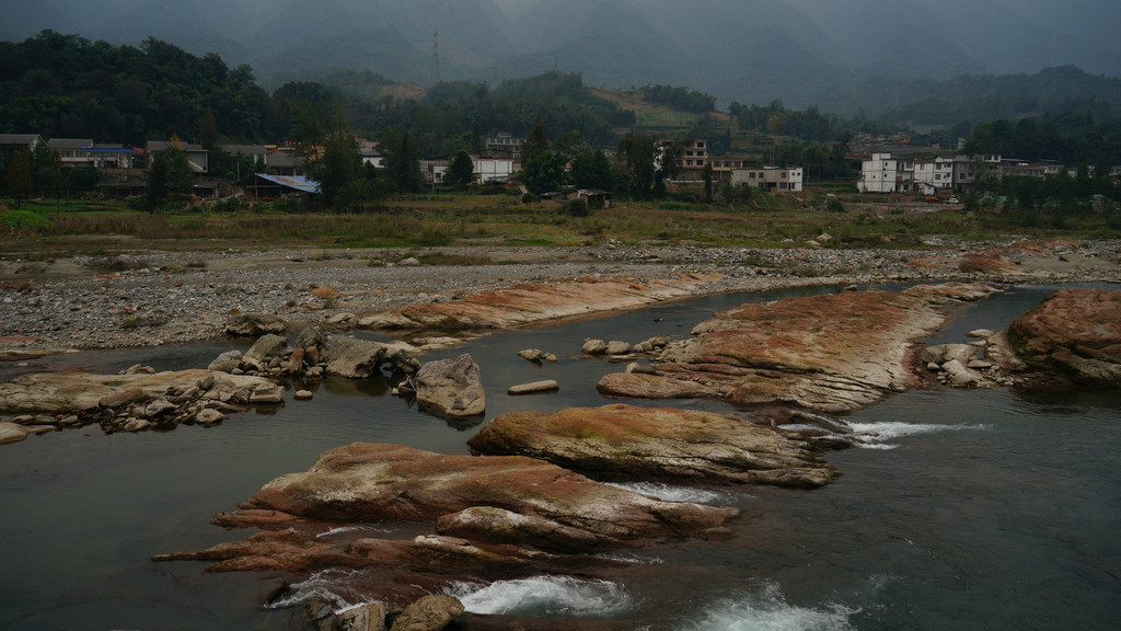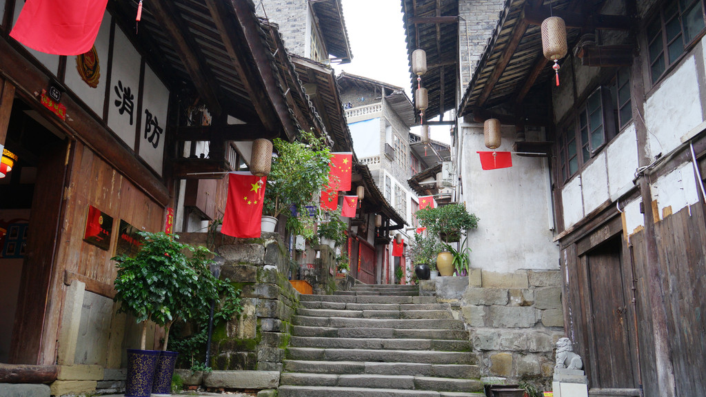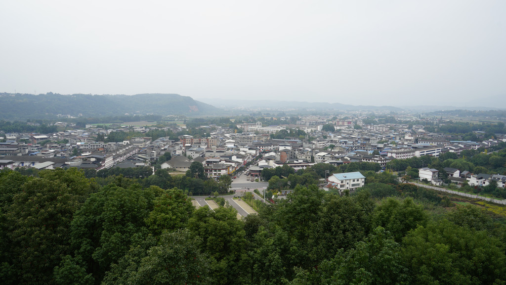 古镇溪水环绕。青山逶迤,蜀文化浓郁