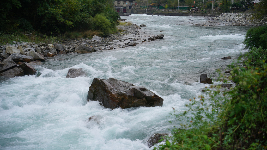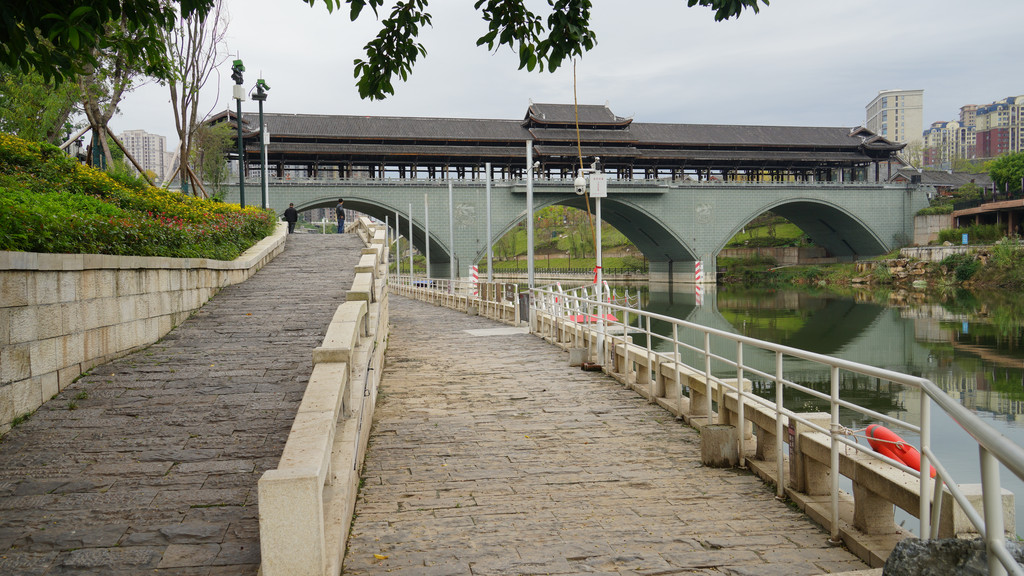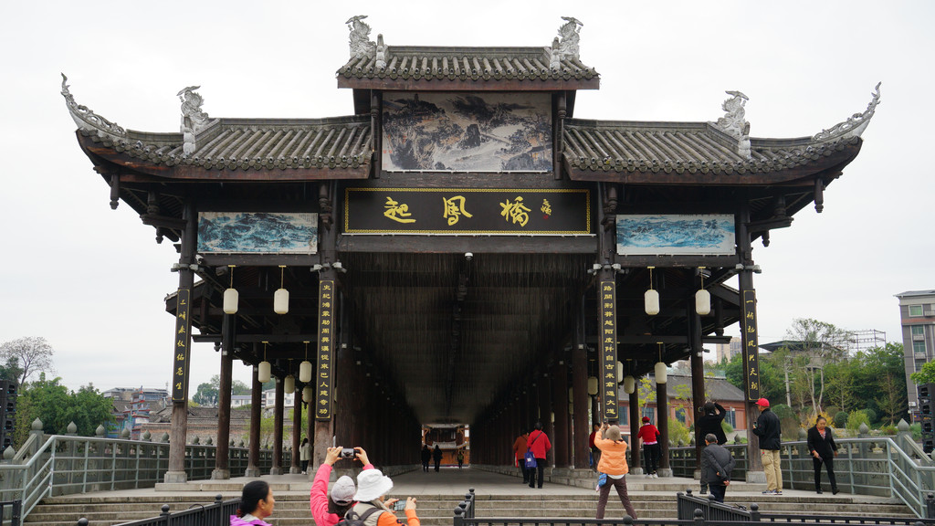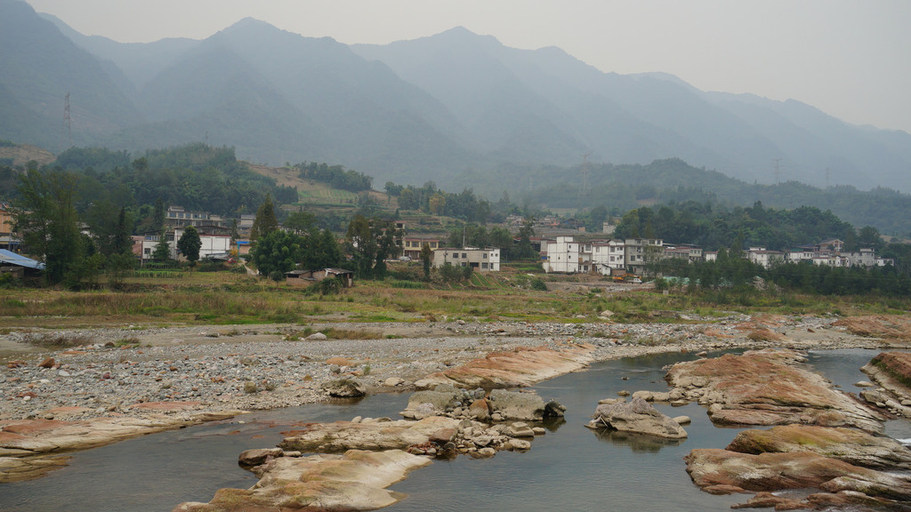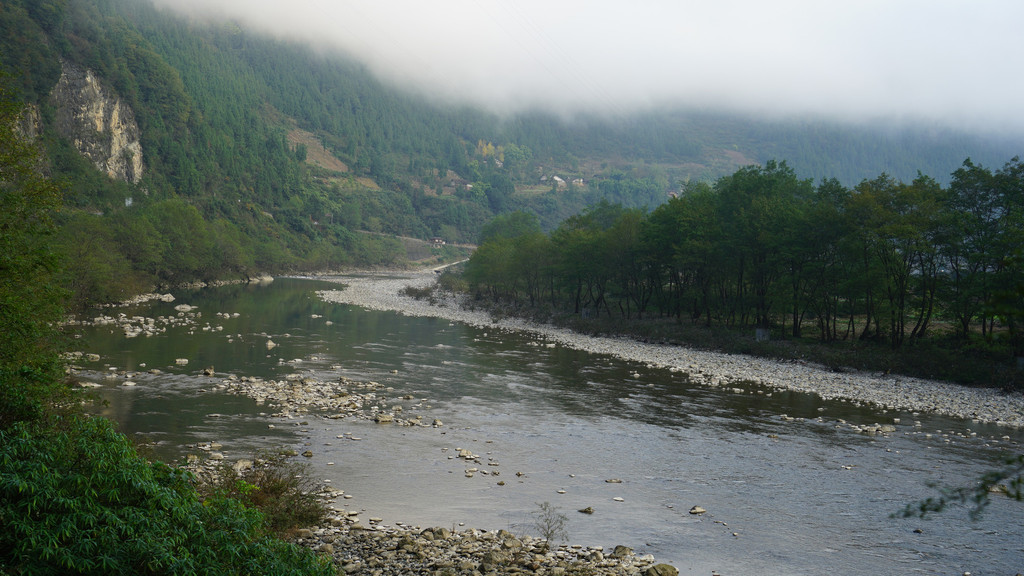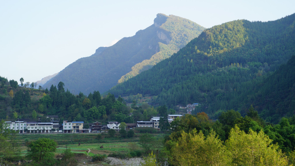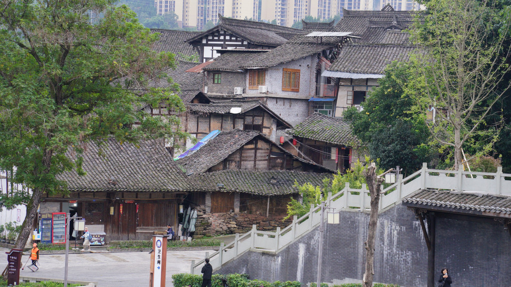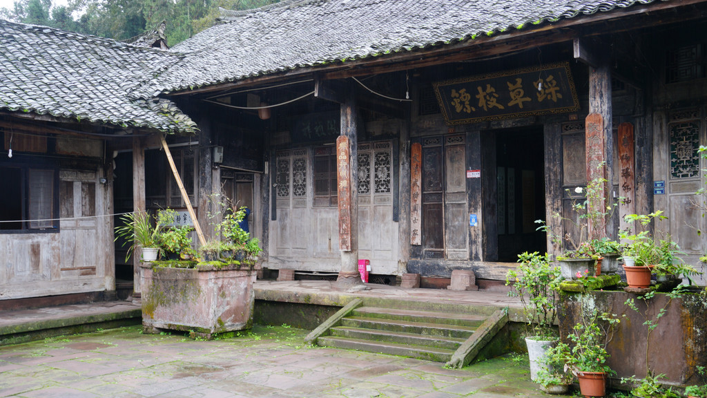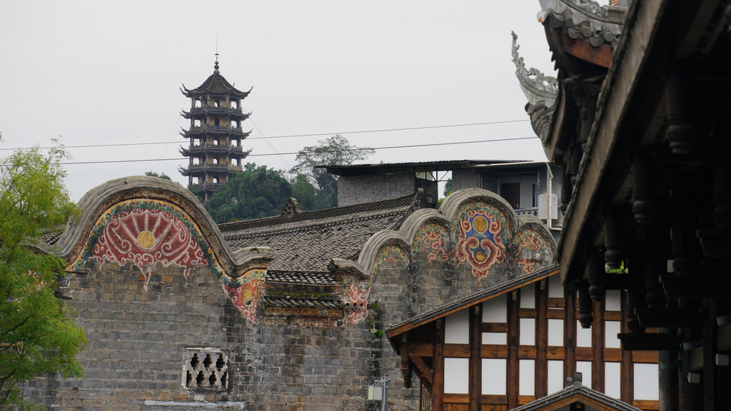 古镇溪水环绕。青山逶迤,蜀文化浓郁