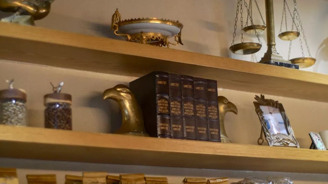 法国可拆卸双子天平,两端饰有正义女神“朱蒂提亚”,象征法律与公平。天平由黑白纹大理石板为基,整体黄铜打造,横臂下垂衡盘,四足铜环支撑。使用至今此天 平依旧不偏不倚,可见欧洲匠人严谨制物之初心,气质庄重,兼具艺术性及实用性。