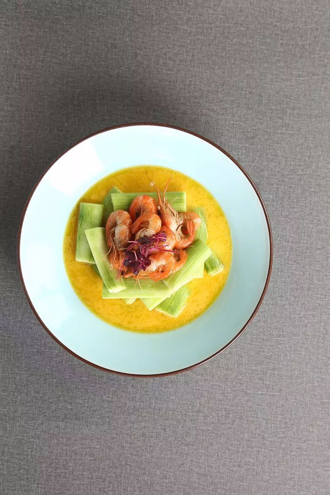 不同凡响的入味汤汁,搭配丝瓜的鲜爽与紧致的虾肉,这是一道很是讲究大厨功夫的菜品。金色的汤汁浸润着翠绿的瓜条,色彩黄绿相间。