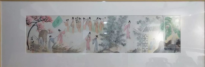 餐桌正对面的作品来自马得先生,用色非常自在。他的马得昆曲戏画艺术馆落户苏州中国昆曲博物馆,马得先生把自己几十年来创作的《牡丹亭》、《西厢记》、《十五贯》戏曲绘画精品100幅捐赠给苏州中国昆曲博物馆,同时捐赠的还有其上世纪三四十年代珍藏的昆曲典籍《六十种曲》、《盛明杂剧》、《缀白裘》等。长桌周围墙壁上,还有薛亮、邓家安、顾静、金潭等画家的作品,都是清雅秀丽的风格。