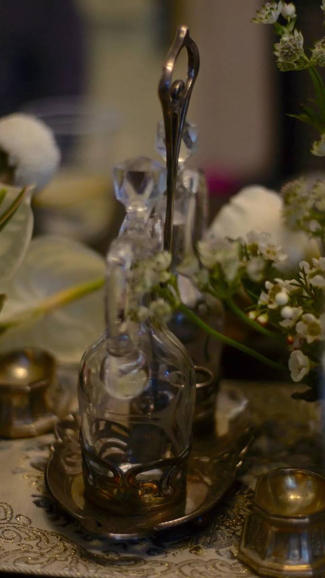 此套福腾宝WMF出品油醋壶组,为新艺术运动风格优秀作品,利用WMF专利镀 银技术,确保器物坚固耐用并兼顾银器优点。调味座镂空线条设计,突出表现新艺术运动的自由韵律感线条,典雅别致。油醋壶一对为手工制作水晶壶,植物形线条纹饰与调 味座相呼应,优雅高贵。