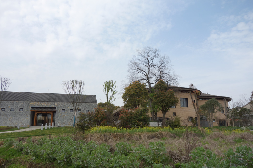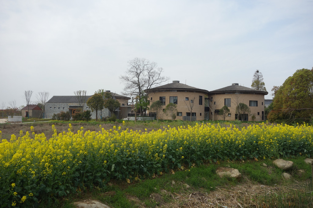 油菜花成丝绸状环绕着田埂,不远处的两栋体量颇大的“谷仓”很吸引眼球。看了很多关于“未见山”的介绍,知道这不是我们为之而来的未见山,更加的好奇这么有趣的建筑到底是啥?看了路标原来是一家谷仓艺术酒店。