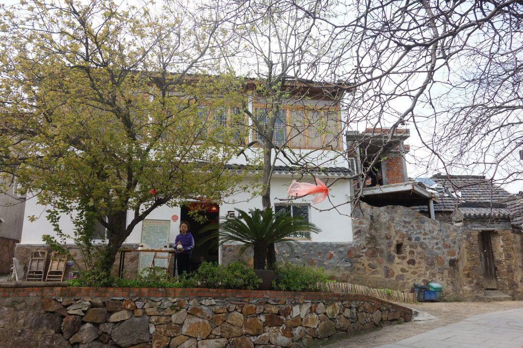 站在大堂门口,眼前的画面是新旧搭配的场景。前景是村中古老的石头屋,后景是村中现代化的村舍,有传统的继承与现代的发展。