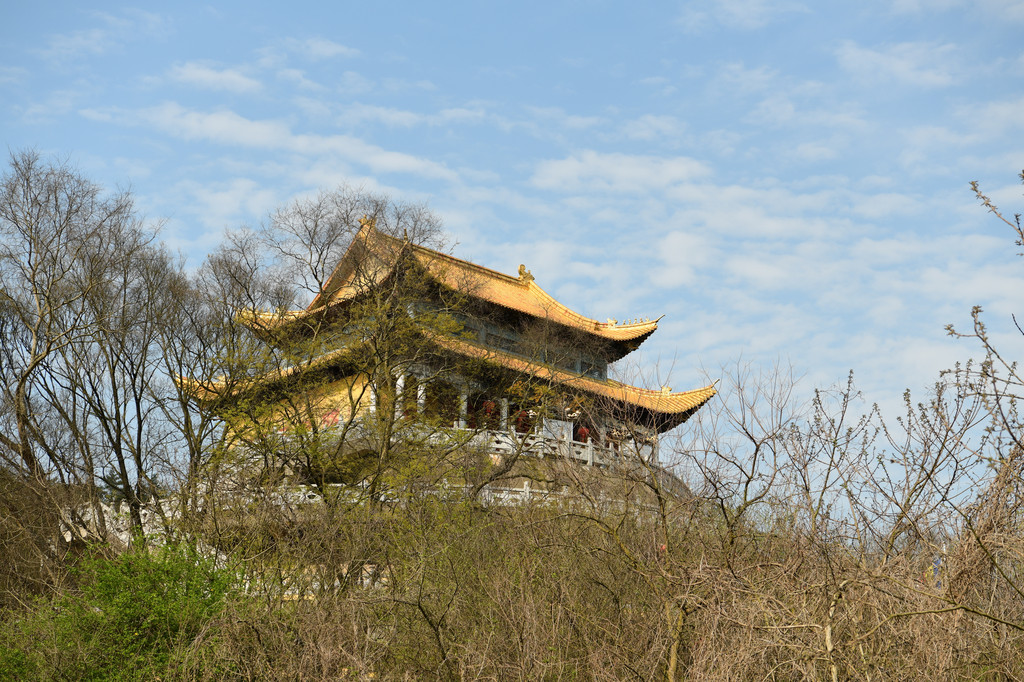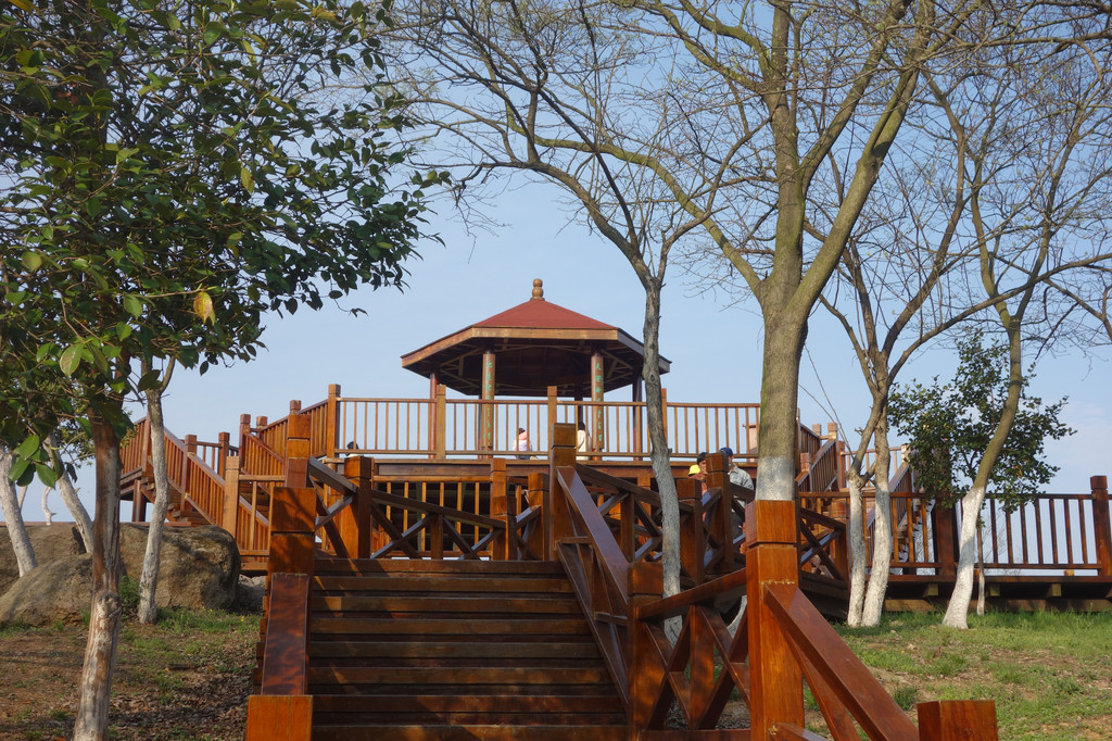 离开环翠阁再走数步是这座木制的招云亭。用木制楼梯搭建了一个山顶平台,平台上建有一个六柱六角的木制亭。屹立在山顶的亭高入云间,与蓝天白云为伴。