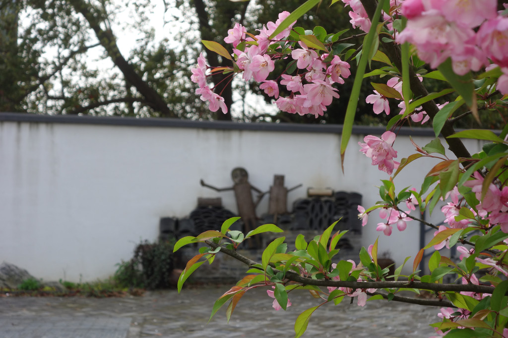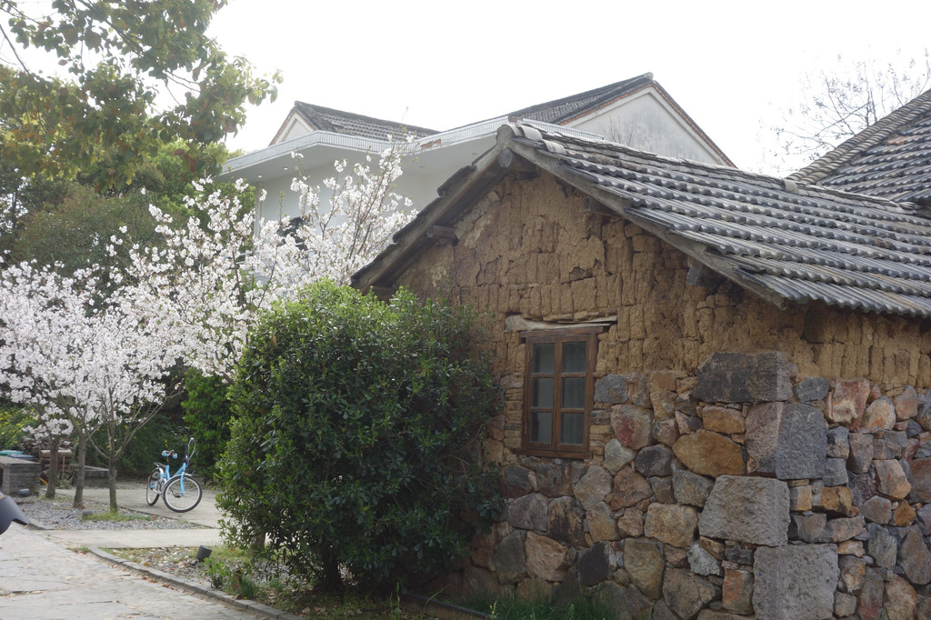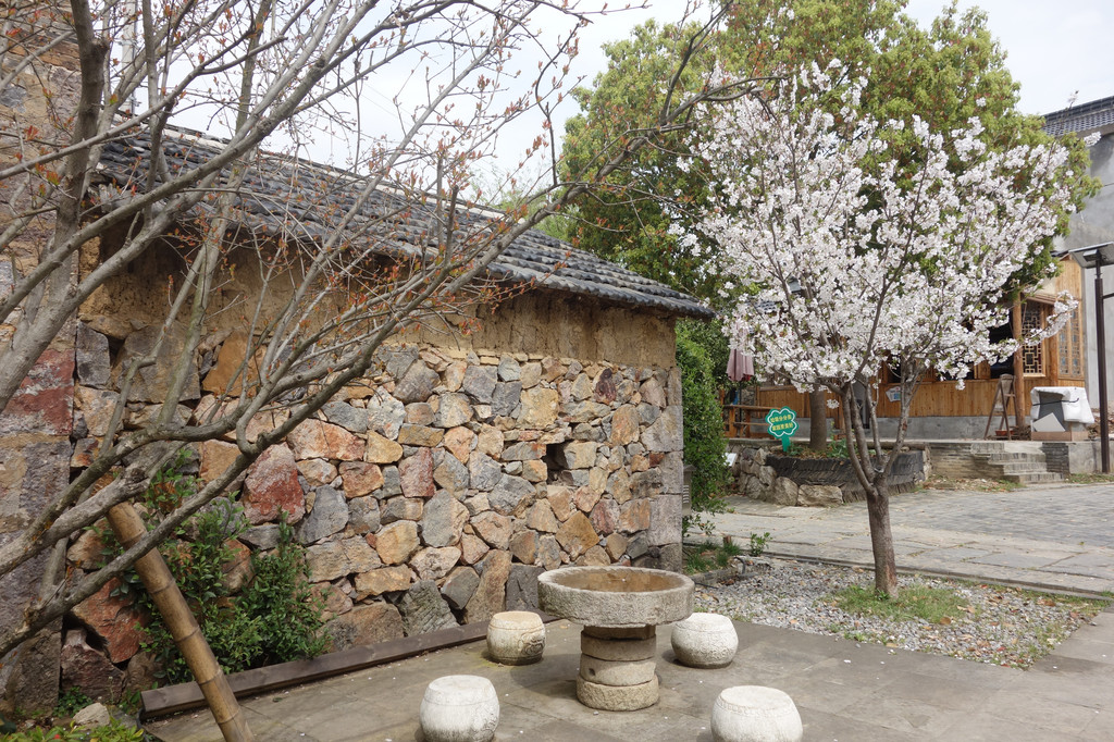 石头垒砌的屋,青瓦敷顶,院中的石桌石凳因为圆形的造型给原本硬朗的材质增添了柔情,加上一株株粉粉的樱花,一切都诗情画意起来。不论晴雨,在这里静心,品茗,看落花细雨,这份悠哉的情调是我喜欢的模样。