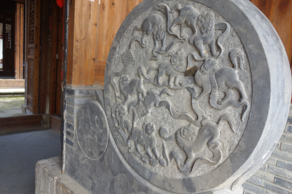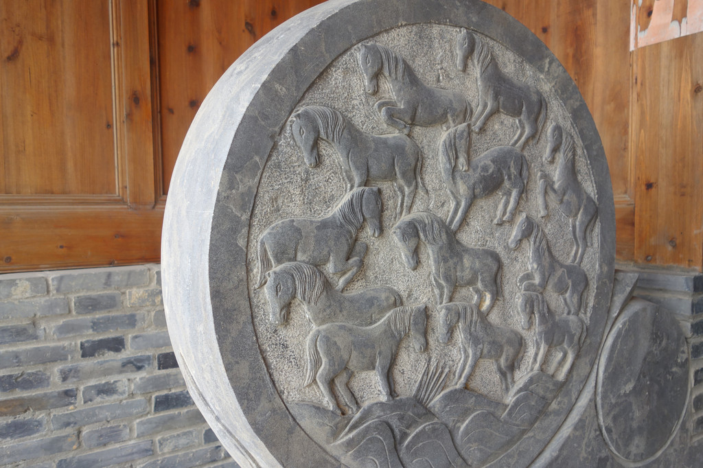 宗祠前的两块抱鼓石上雕刻着马群。