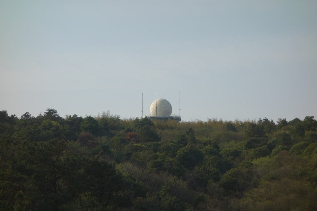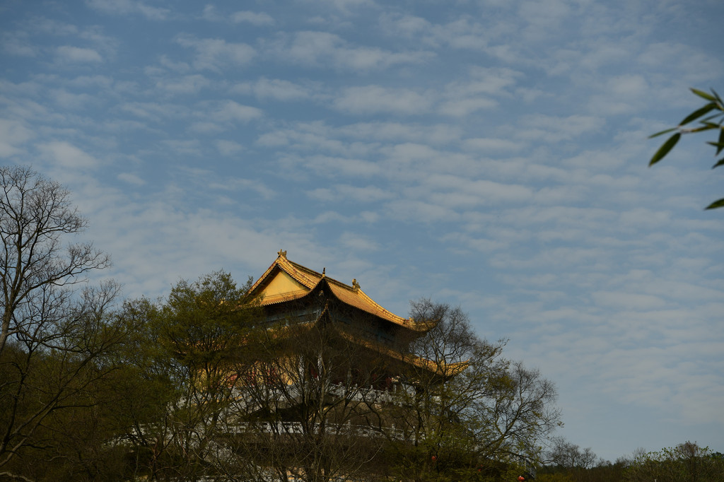 无想寺不是我印象中的四四方方的寺庙的模样,而是一栋整体为圆形的建筑。建筑曾金字塔式堆叠层层向上,在最上层的平台上是一座方正的寺庙,两层黄色屋顶挑檐。黄色屋顶挑檐就好似一顶帽子覆盖在青翠的山岭之上。