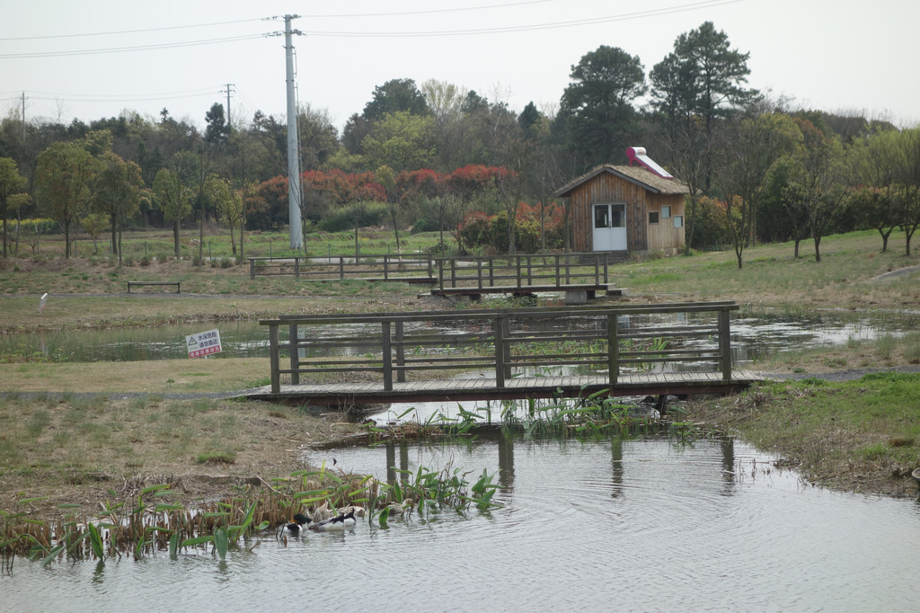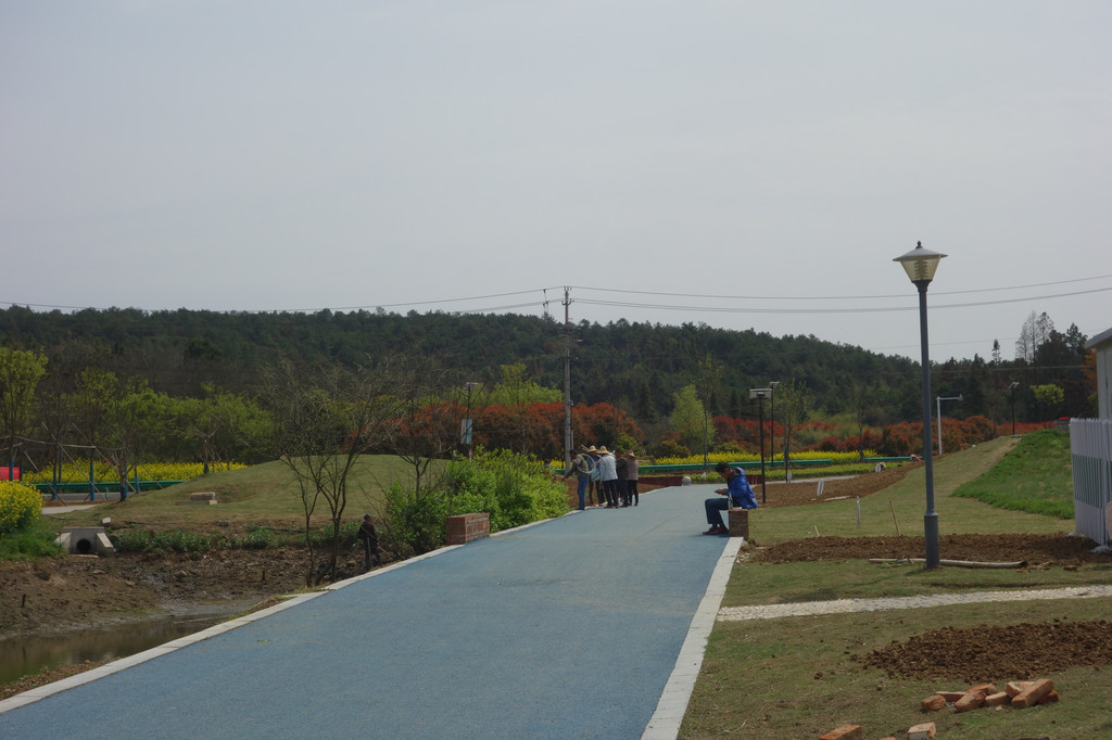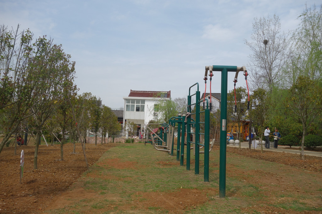 很好奇,顺着池塘边的村道接近它。池塘一侧一字排开的市民健身器材。