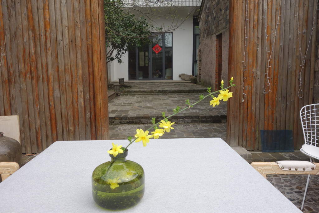 走进门厅,看到的是老墙残壁与现代风情的完美融合。古朴的房屋、轻工业风的摆设一切都显得那么的自然和谐。他熟络的和服务员打着招呼,说十分钟就出来。经过看苏康码,免洗酒精消毒的程序,我们进入酒店。