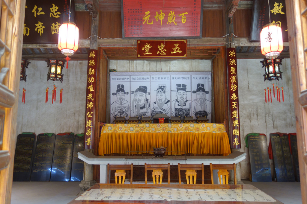 宗祠内的五忠堂。据传600年前与刘备同宗的中山王后人,举家搬迁至此,现在宗祠内还有保存完整的起源于西周的十三本刘氏宗谱。