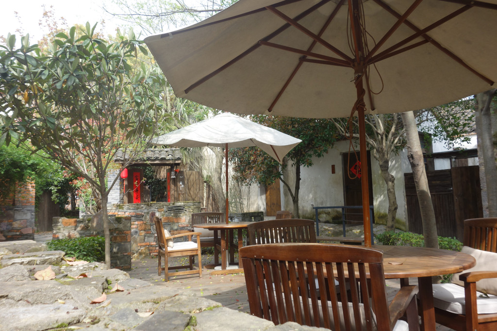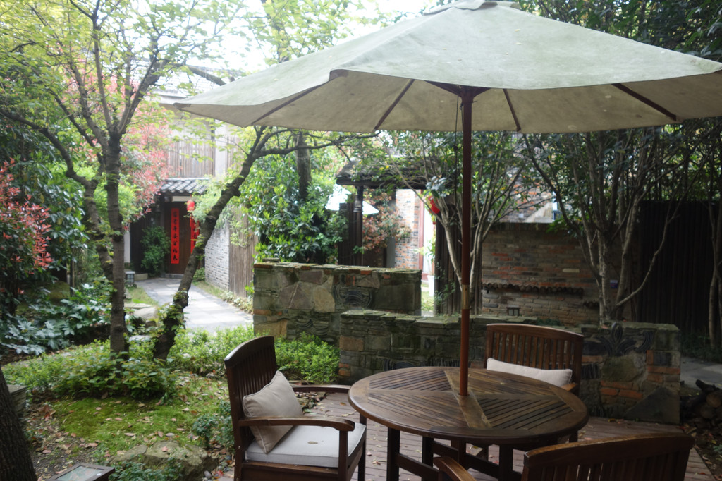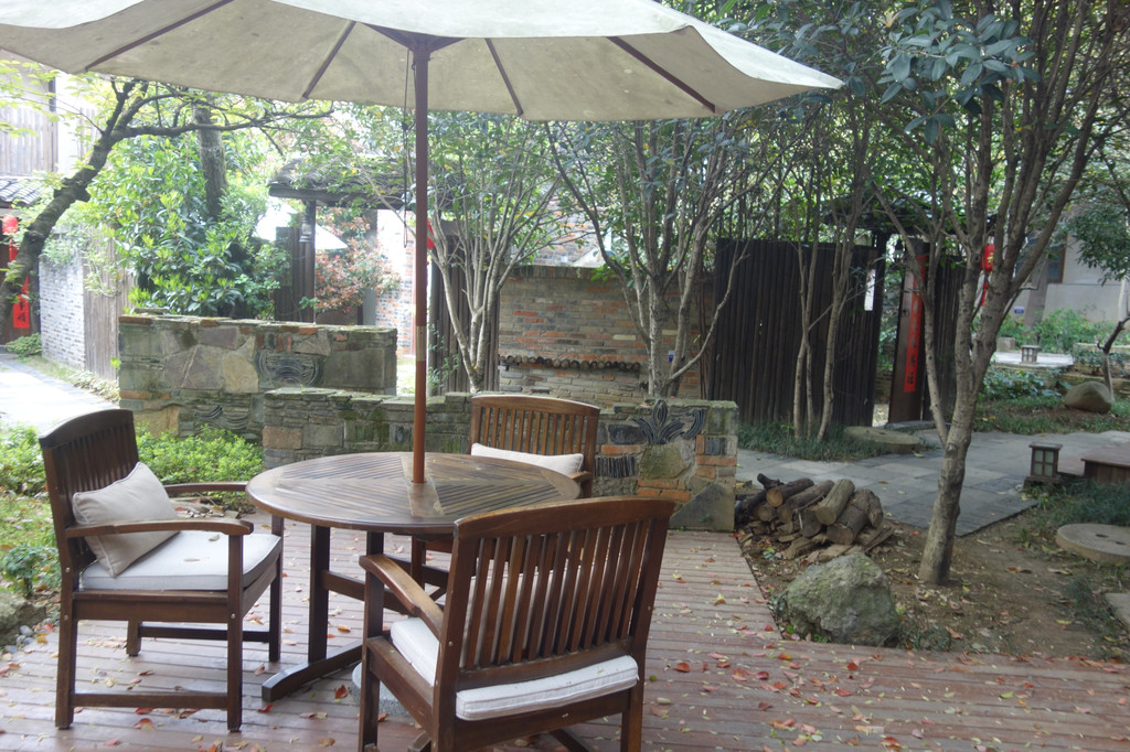 院落中的灰色石砖墙好似中国古典建筑中常用的迎门墙,既有装饰效果,还有一定的间隔作用。墙后一把白色的大阳伞,木质桌椅,这里才是真正的享受私人空间,享受生活惬意的开始。