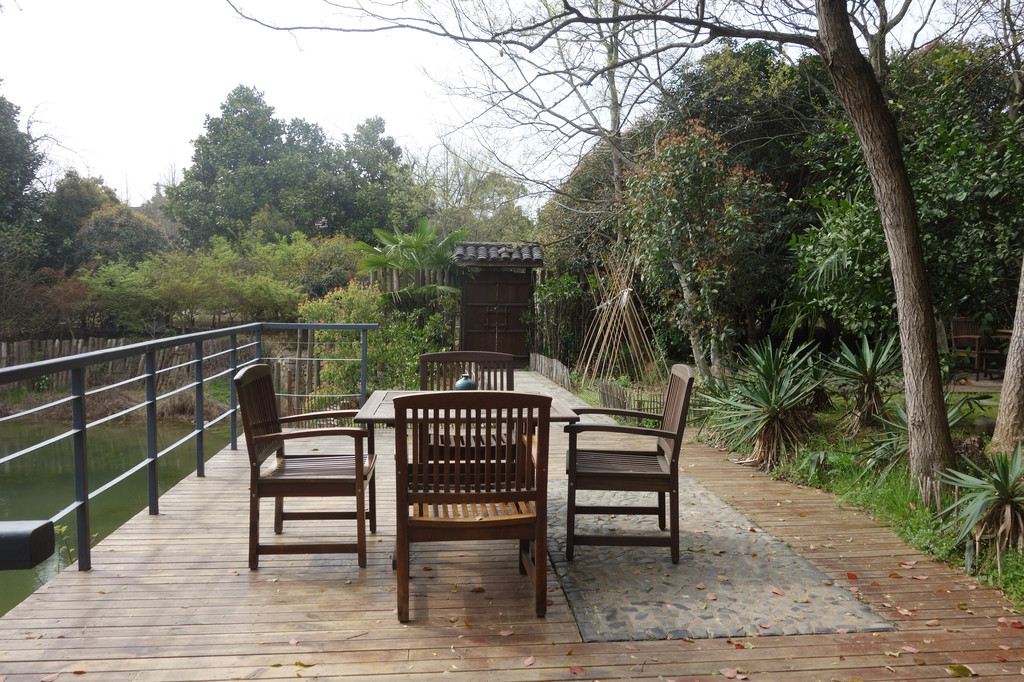 池塘边的平台设计非常独特,由木头打底,鹅卵石勾调而成。几张木椅环抱木桌。一道木栅栏门通向村中,与村中联系沟通。