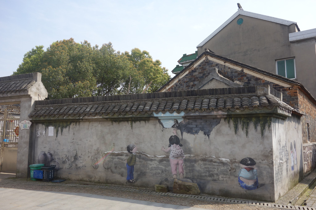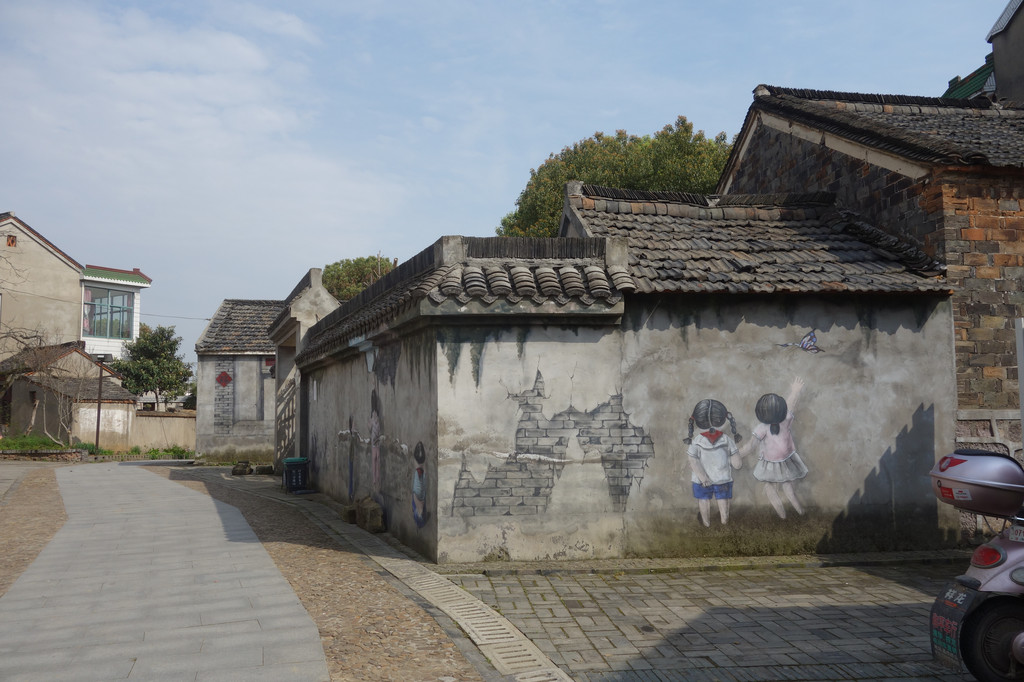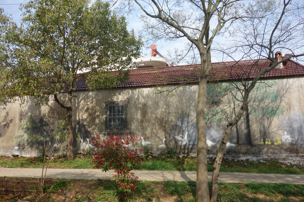 质朴的灰色水泥墙因为墙上一群可爱的白色大鹅,黄色小鸭而生动起来。千年古村落的古朴与现代艺术浪漫的结合,相得益彰。