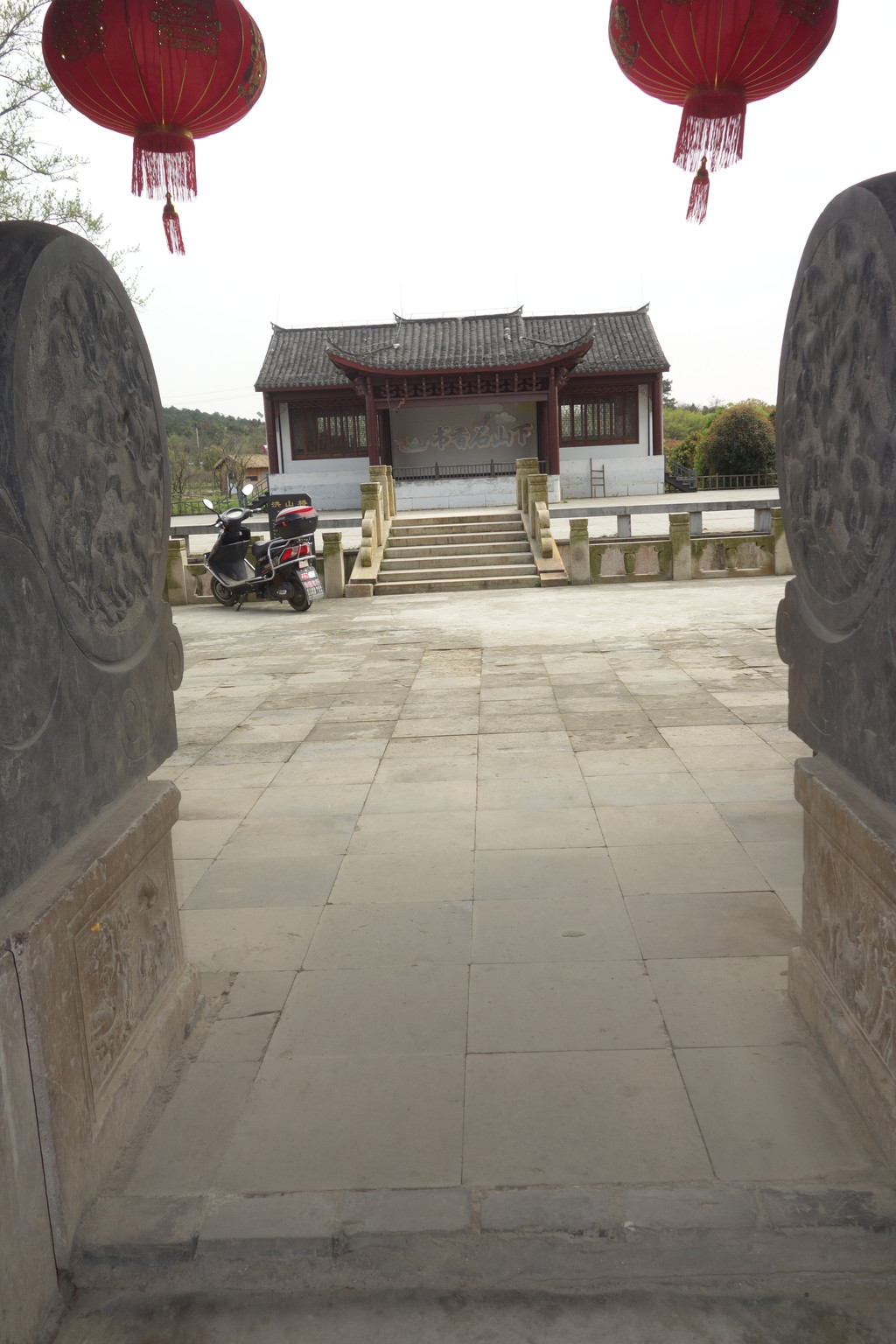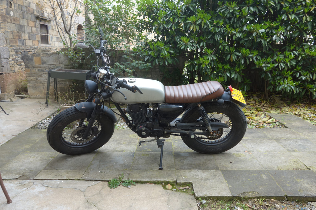 一辆硬朗的摩托车停在青石板上