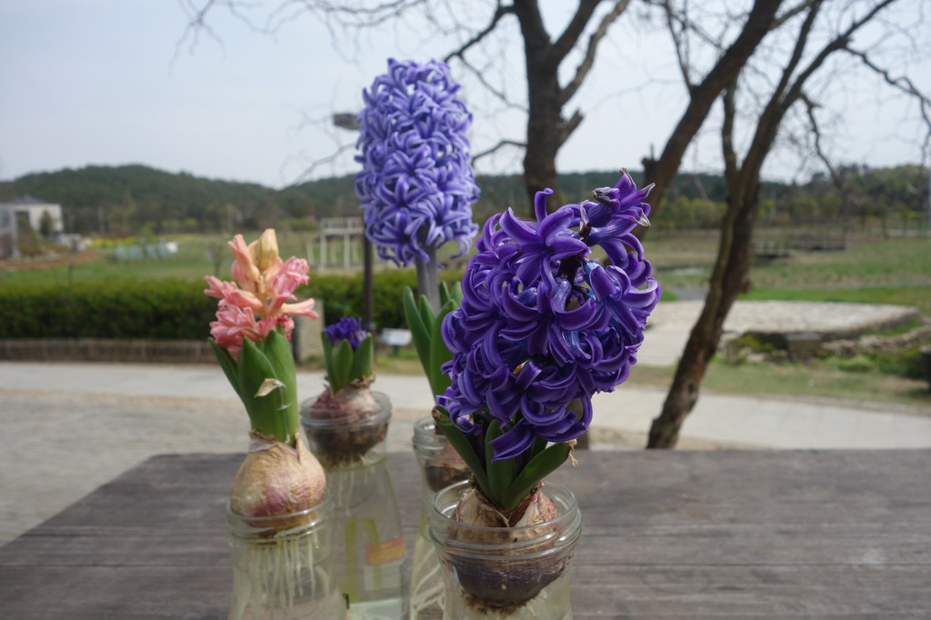 坐在小铺前的木质平台上吃午餐,桌上点缀着水培鲜花。