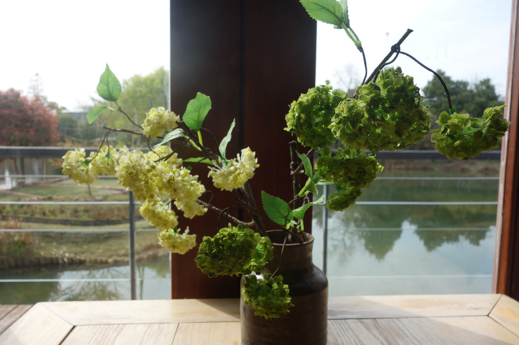 临窗的木质小桌上一个质朴的陶土花瓶,瓶中是色彩淡雅的绣球花,