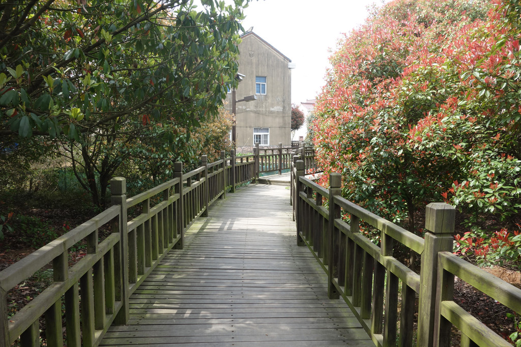 离开游客中心,有一条木制栈道引领我们走入村中。