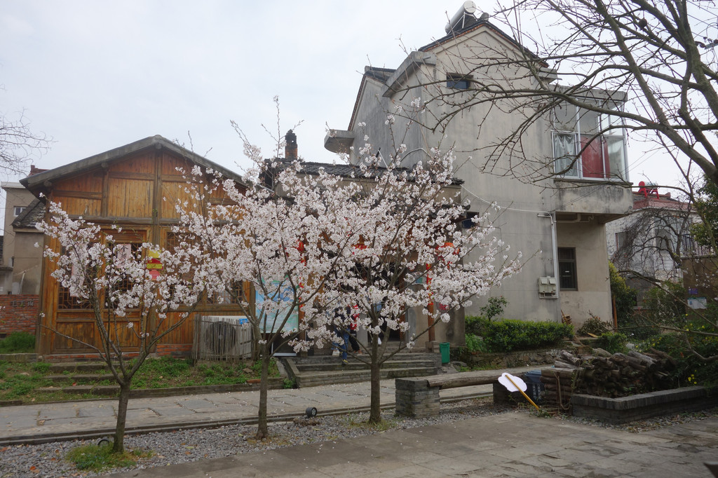 樱花开在木屋前,有点日系街道风。