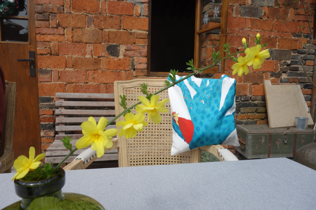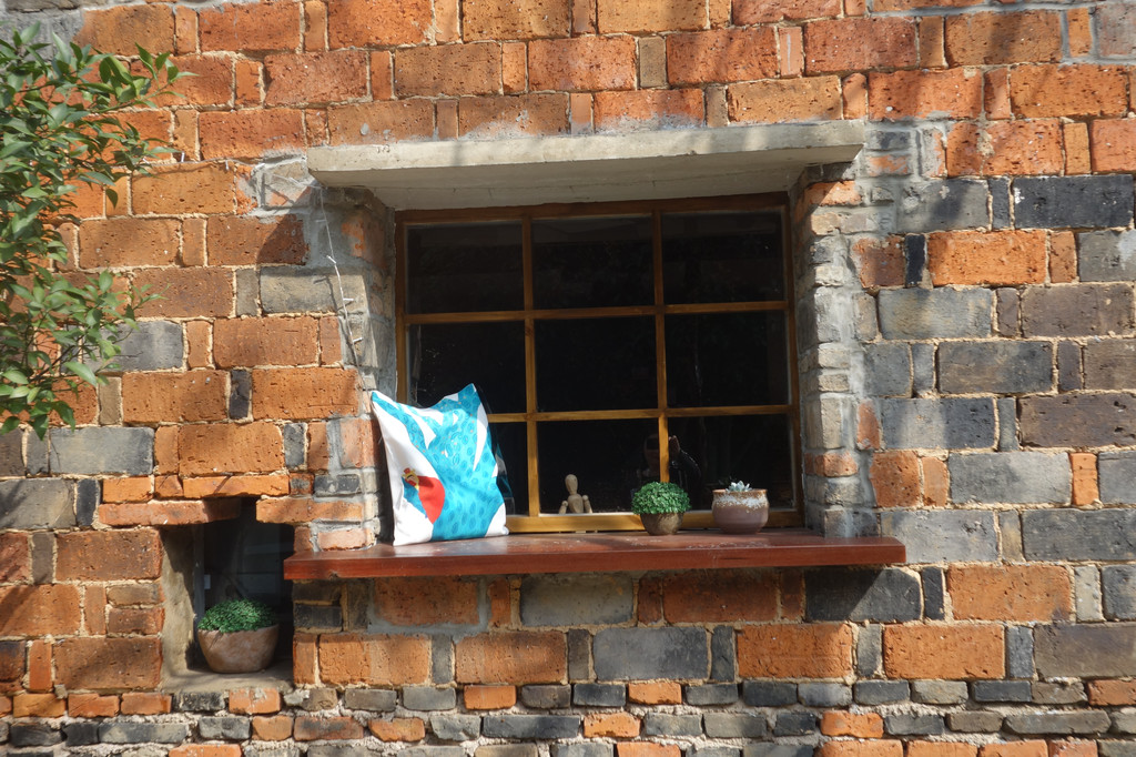 石头围墙,红砖小屋,竹篱笆,青瓦敷顶的小门围合成一个阳光小院。一张桌,几张椅子懒懒地晒着太阳。
