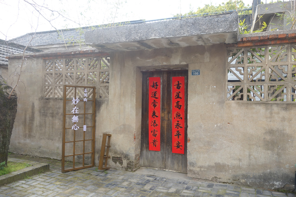 两扇花窗给这片普通的院墙增添了艺术感,怀旧的木门上两条红对联。