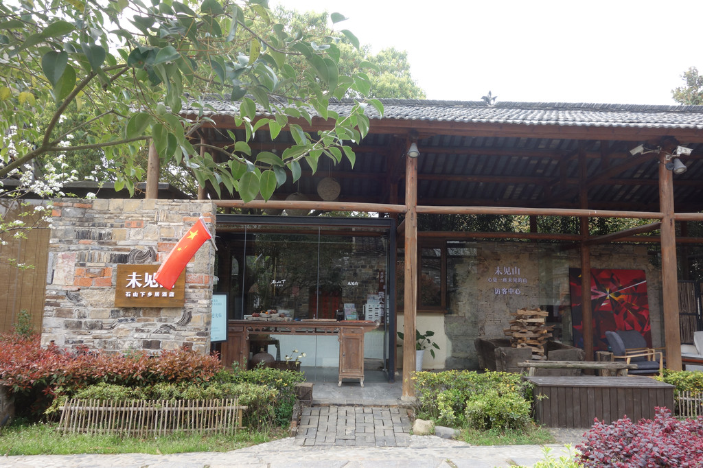 小路边开放式的未见山乡居酒店的大堂。大堂是质朴的石材与木框架,木质长几加敞亮的玻璃前台,屋前屋后小花小草团簇。